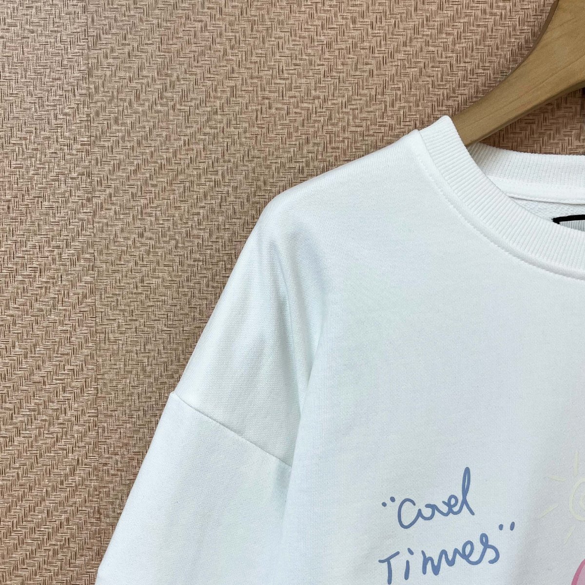 最大の魅力は、フロントにあしらわれた水彩アートプリント。英字とフラワーモチーフが優しくにじみ合い、パステル調のカラーリングで夏の装いを爽やかに彩ります。