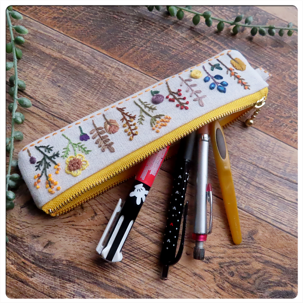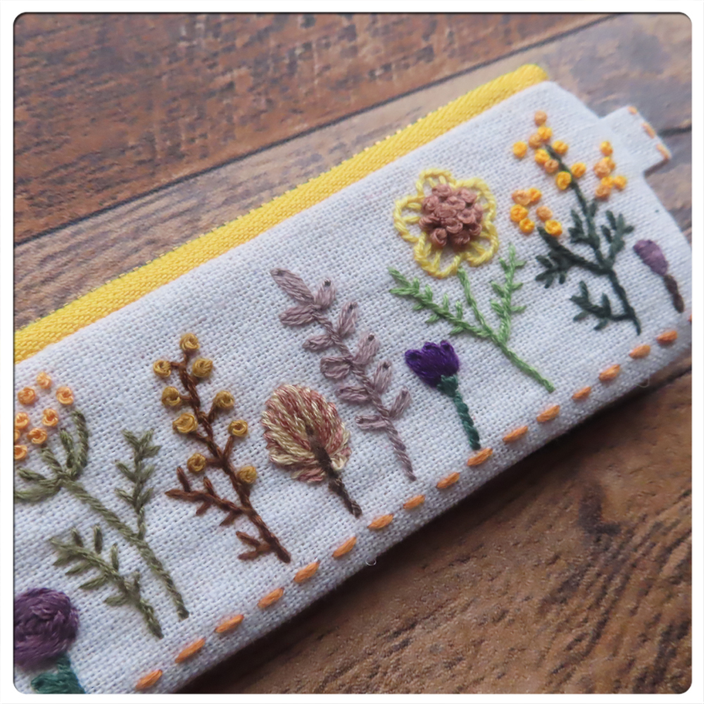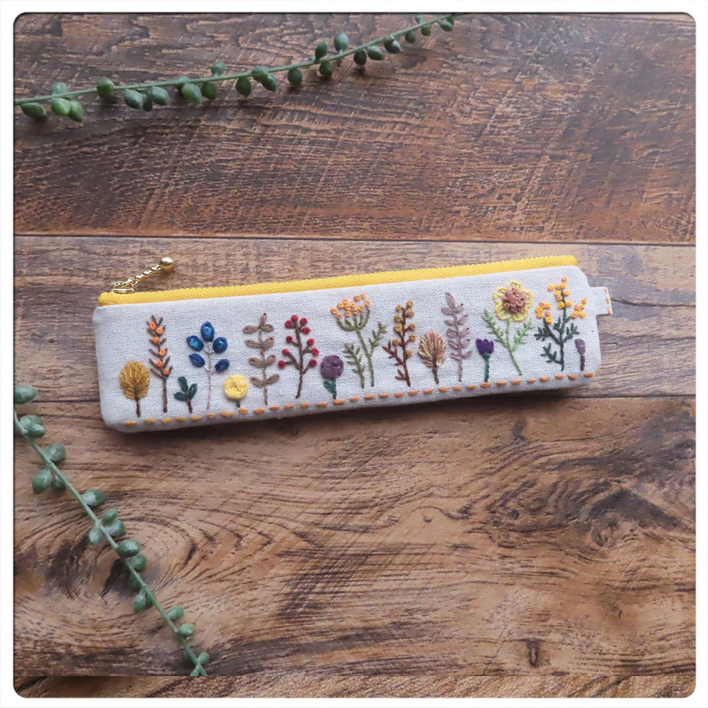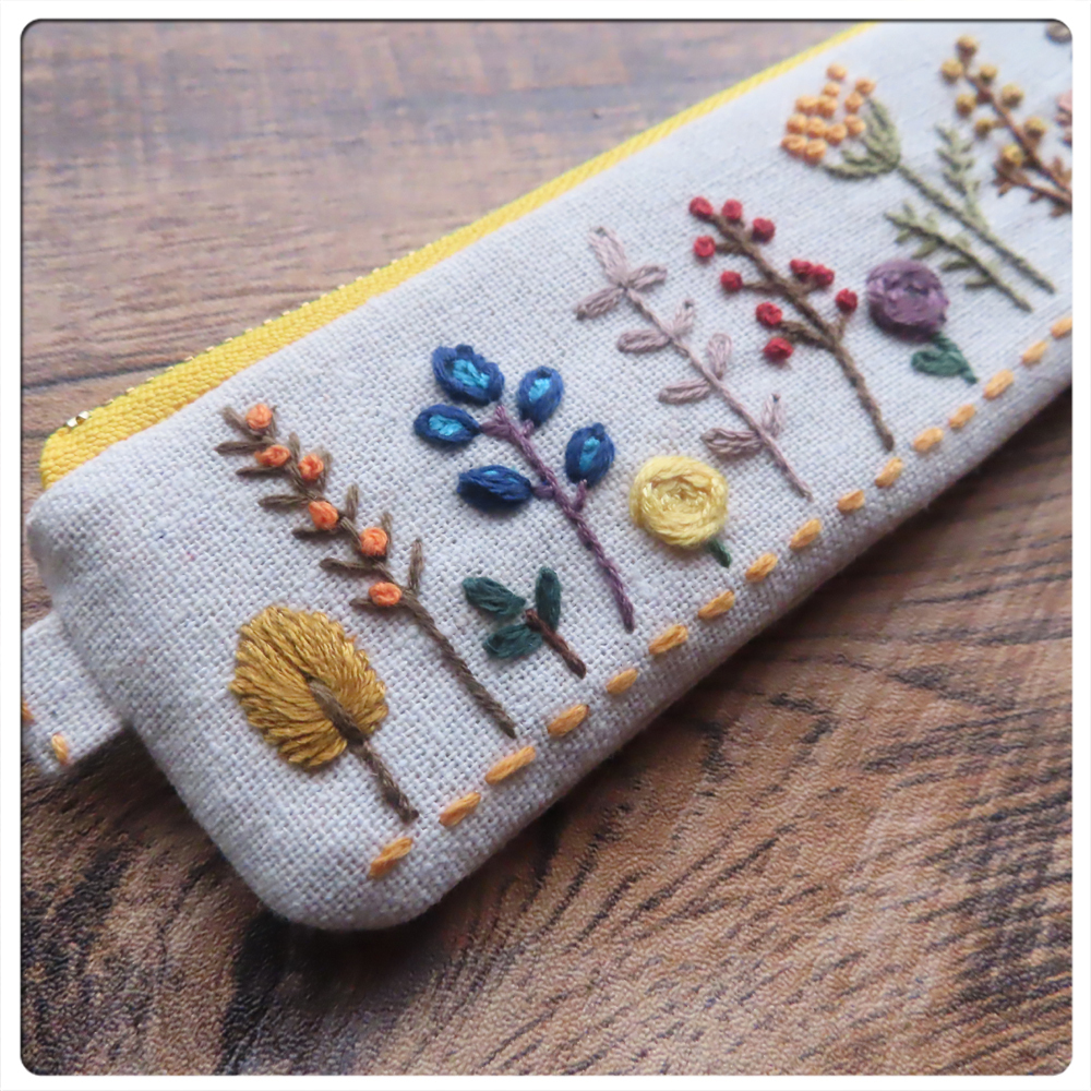 リネンに、小さな草花の刺繍を両面にしてハンドメイドした、スリムなペンケースです。