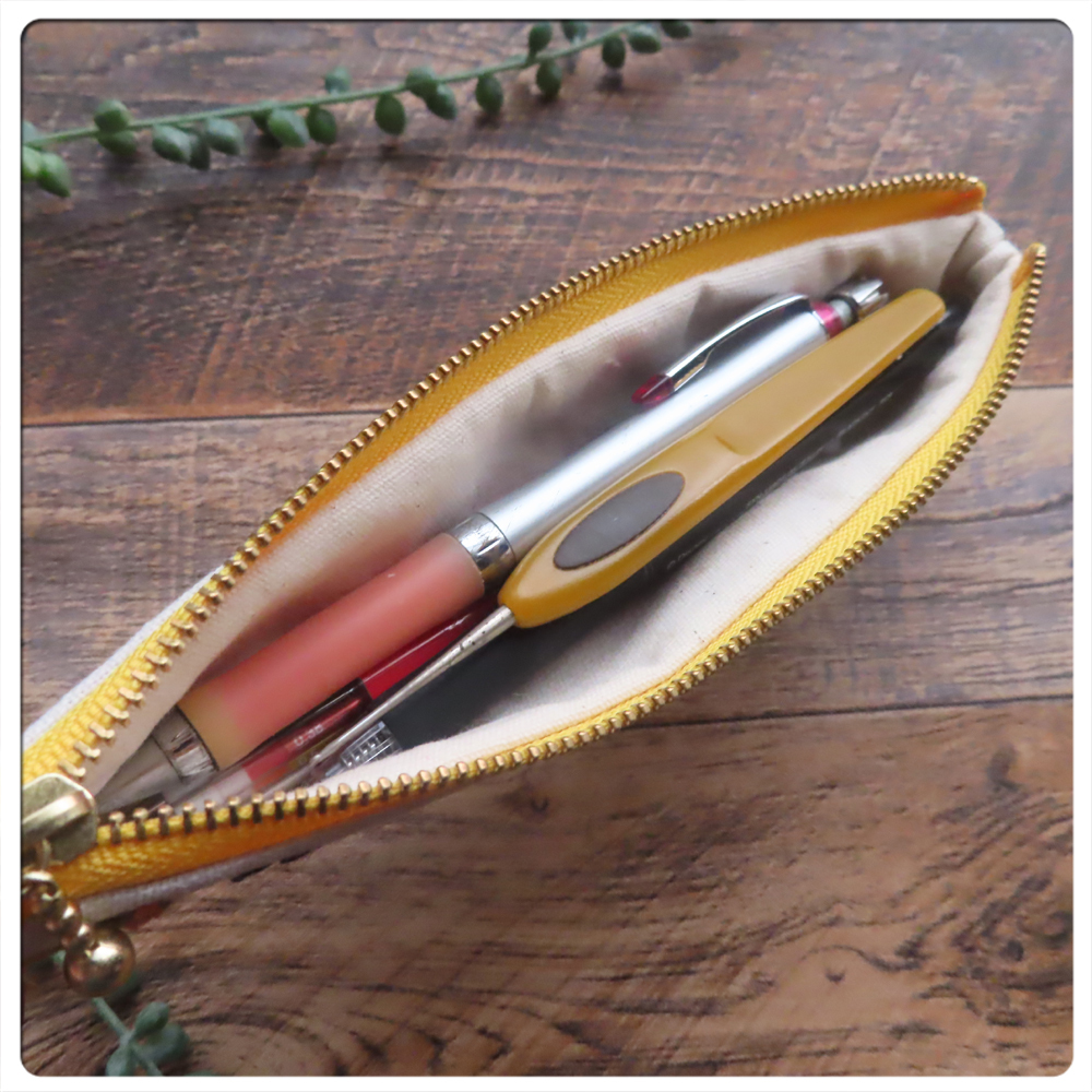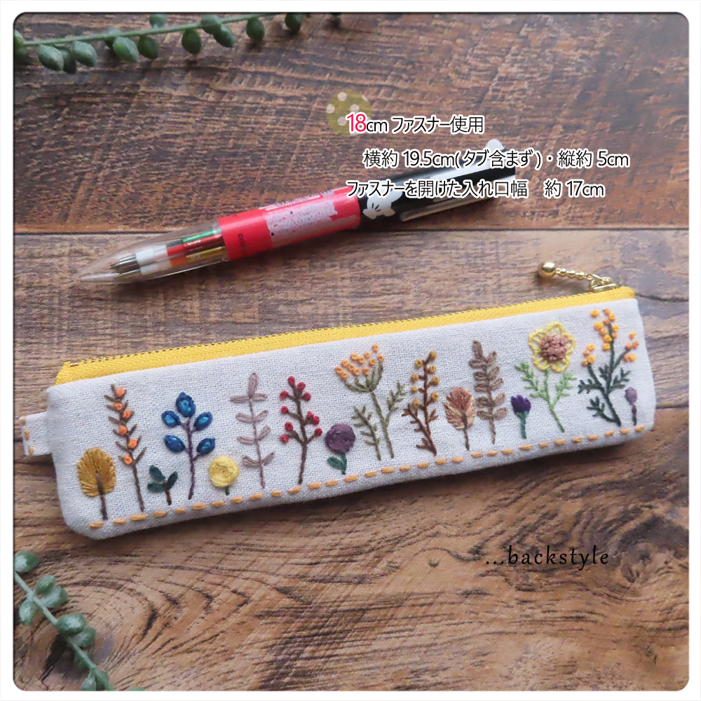 リネン 手刺繍 両面 スリムペンケース 18cm ファスナーポーチ ハンドメイド リネン