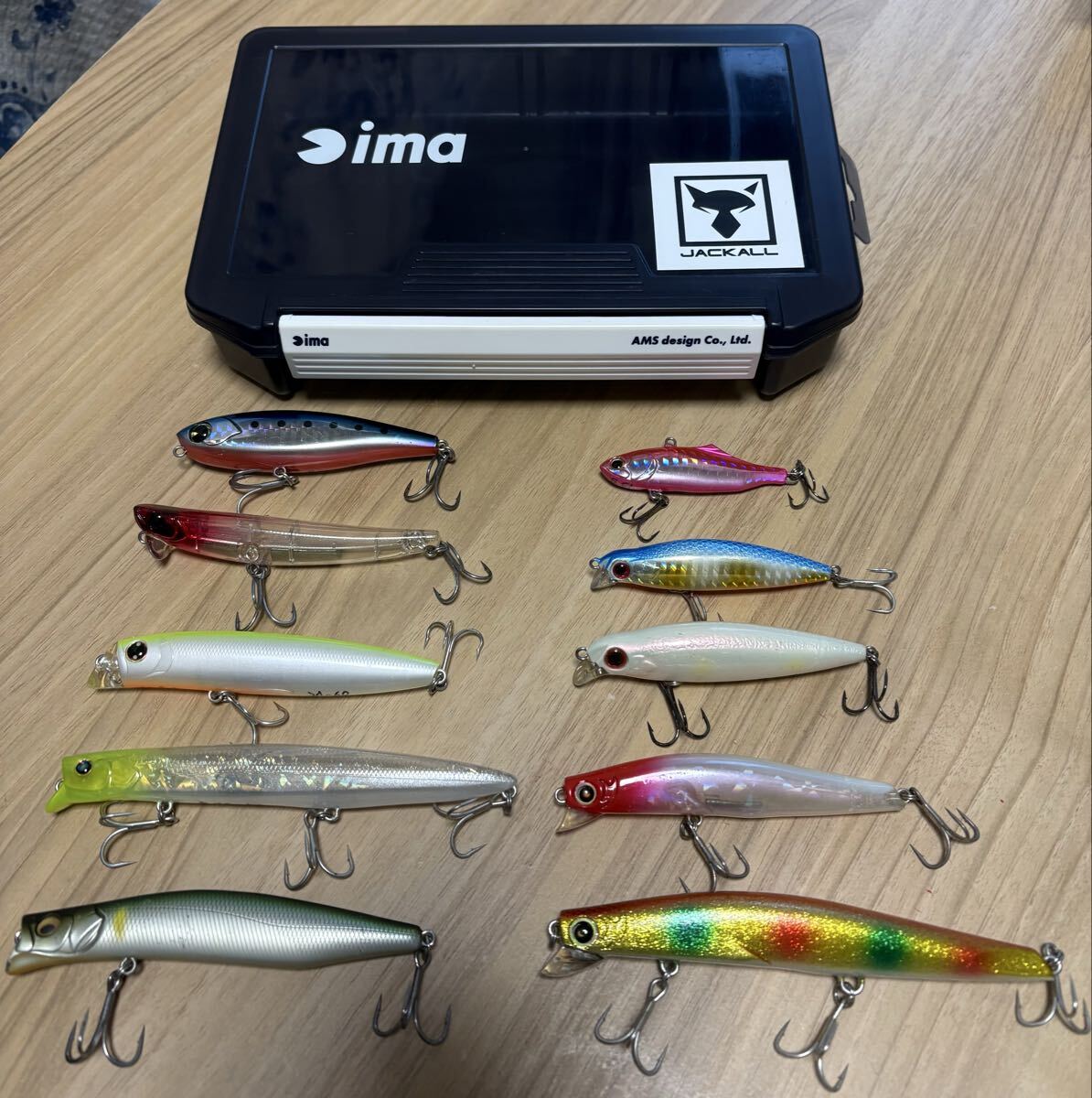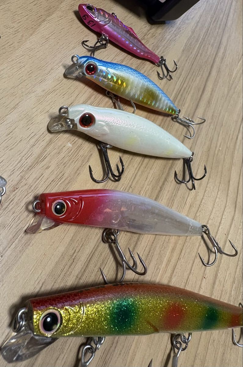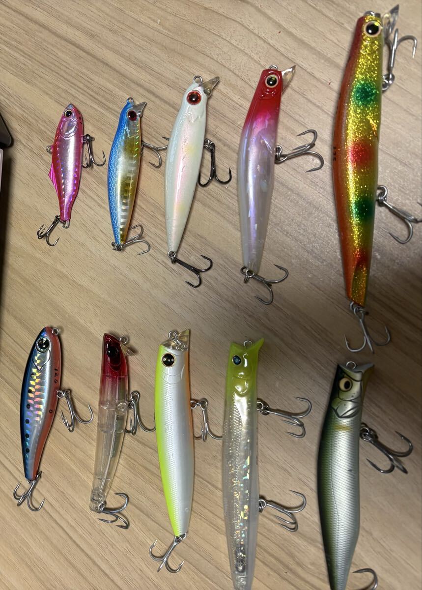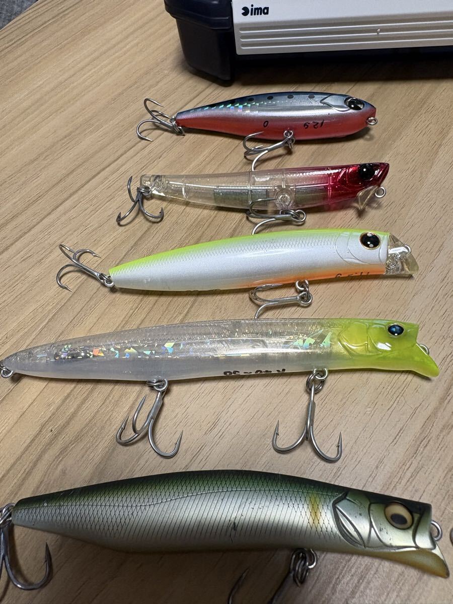 メガバスカゲロウ100 F、フィードリードラブラ125 F、ダイワクロスカウンター F、アピアハイドロアッパー90S、アイマチャッピー80、邪道ゴッツサン125.89各1、マングローブスタジオ マリブ78.68各1、バイブレーション13g、アイマプラケース 計11点