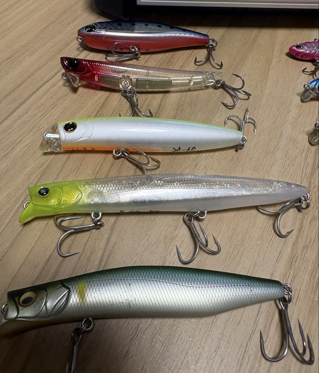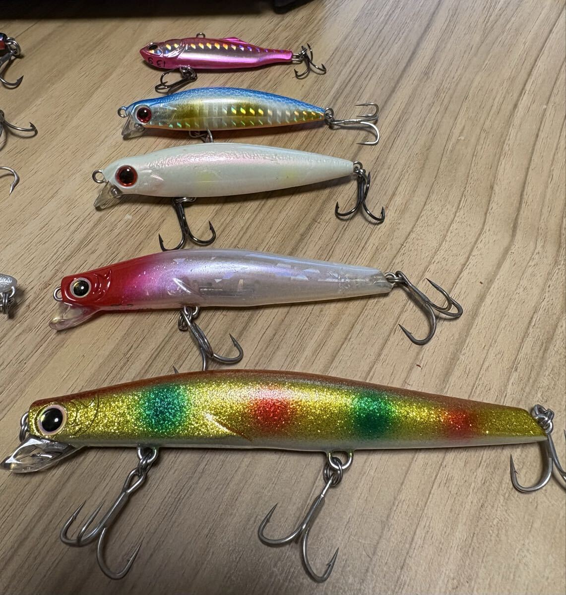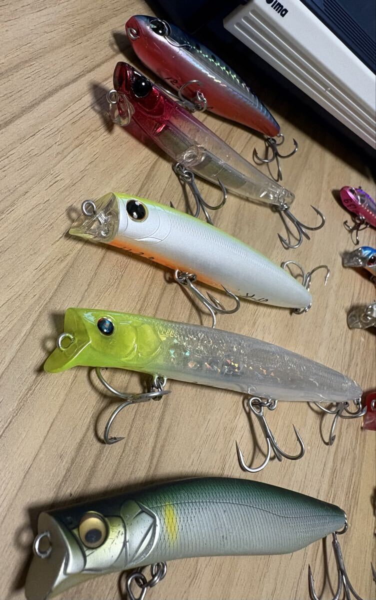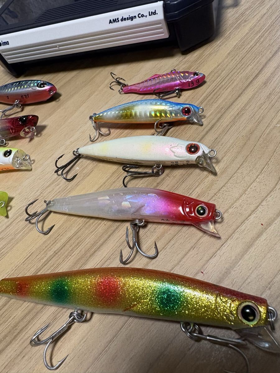 メガバスカゲロウ100 F、フィードリードラブラ125 F、ダイワクロスカウンター F、アピアハイドロアッパー90S、アイマチャッピー80、邪道ゴッツサン125.89各1、マングローブスタジオ マリブ78.68各1、バイブレーション13g、アイマプラケース 計11点