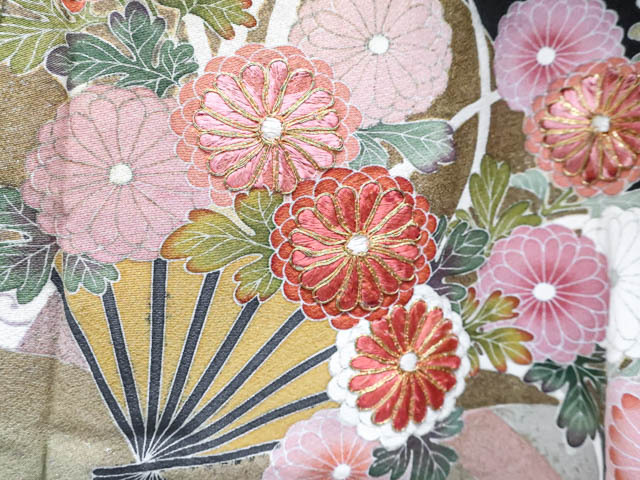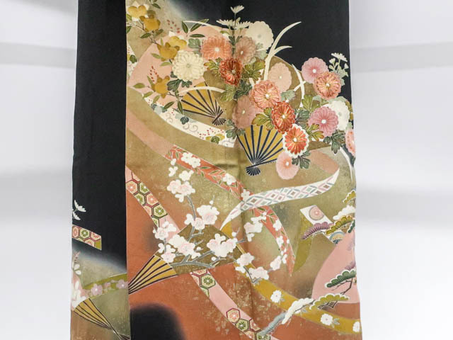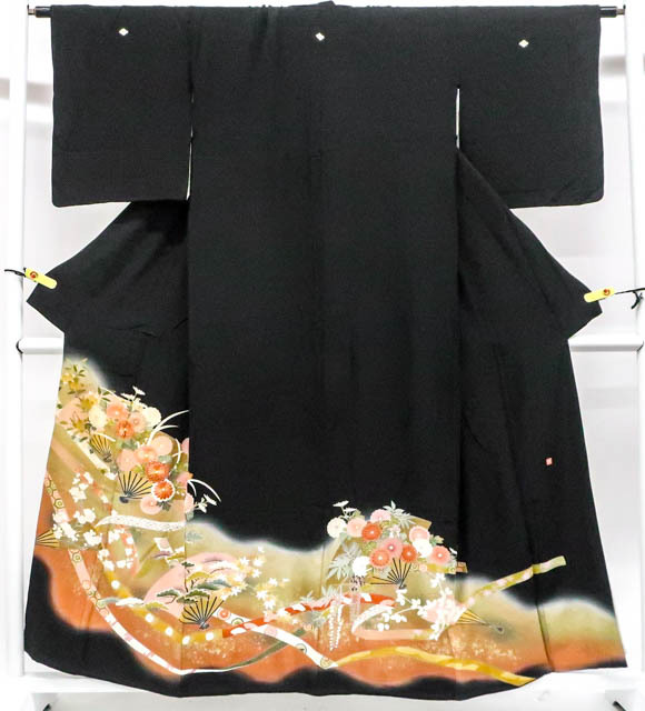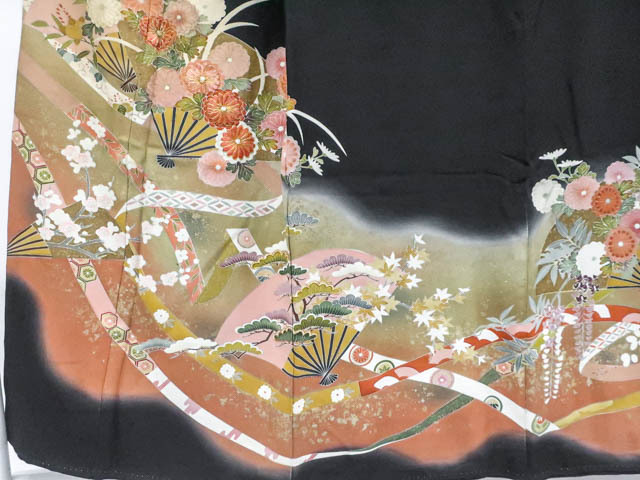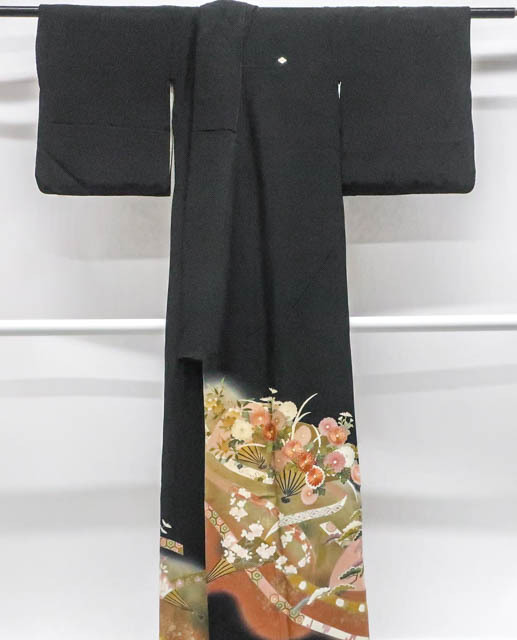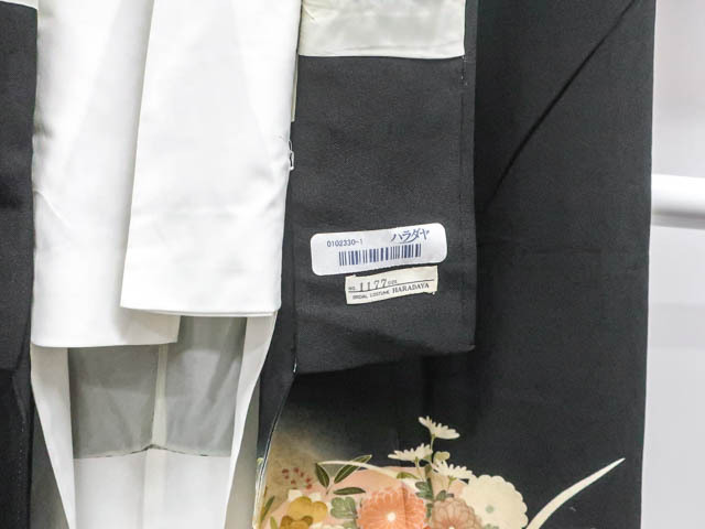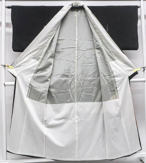 貸衣裳リサイクル商品のため、全体所々にしみ汚れ、レンタルタグがございますが着用可能なお品です。 地色は 黒です。 1枚目の画像が近いお色かと思われます。 素材は正絹です。 |