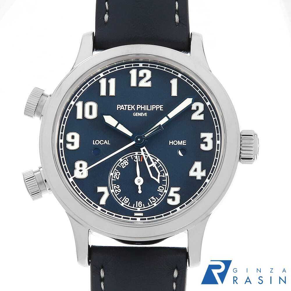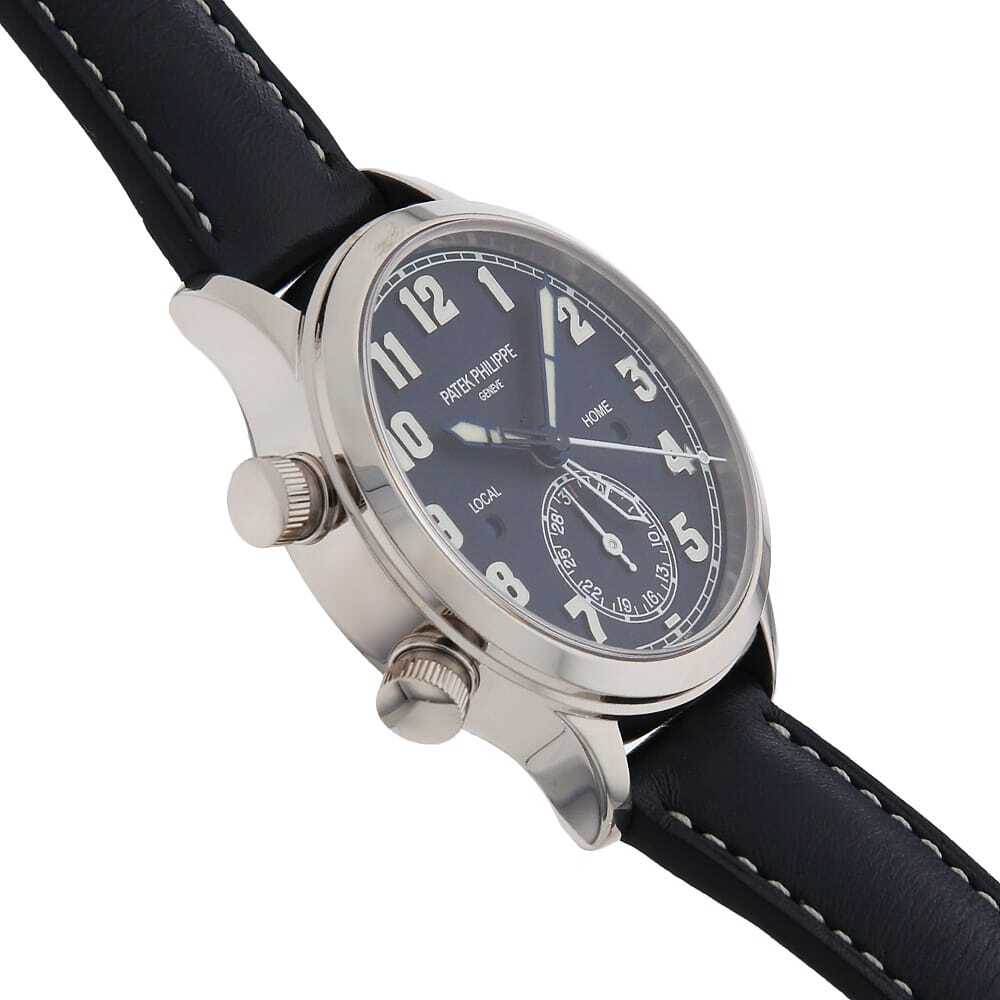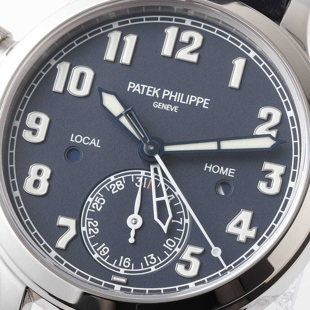 モデル情報 | 2020年に発表された「カラトラバ パイロット トラベルタイム」です。こちらは、2本ある時針で2つの異なる時刻を同時に表示できる時計です。ローカルタイムをケースサイドのプッシュボタンを押すことで表示しますが、1時間ずつ進めるだけに止まらず、1時間ずつ戻す事を可能にしておりパテックフィリップの技術力の高さを感じさせる機能です。IWCのようにもゼニスのようにも見えるパテックフィリップらしくないルックスが特徴です。6気圧防水。ケース径:37.5mm、 厚さ:10.78mmで男女問わずどんな手首にもフィットするミディアムサイズになっています。 |