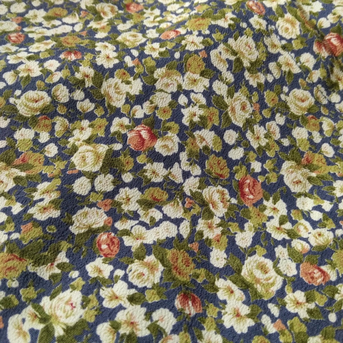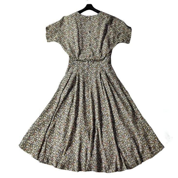 ネイビーにホワイトやレッドのローズのような小花柄が総柄デザインされたワンピースです