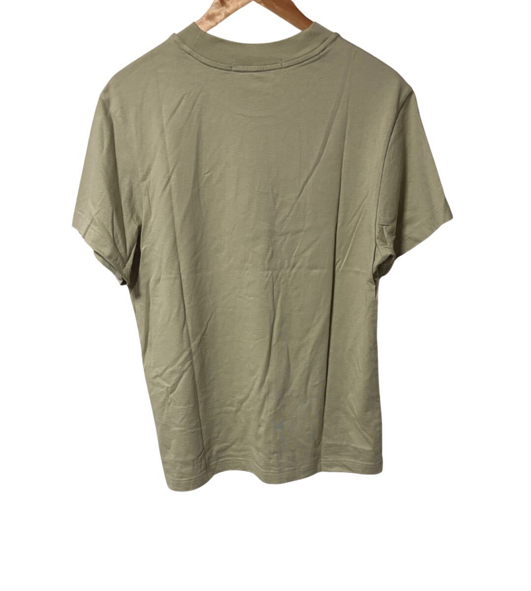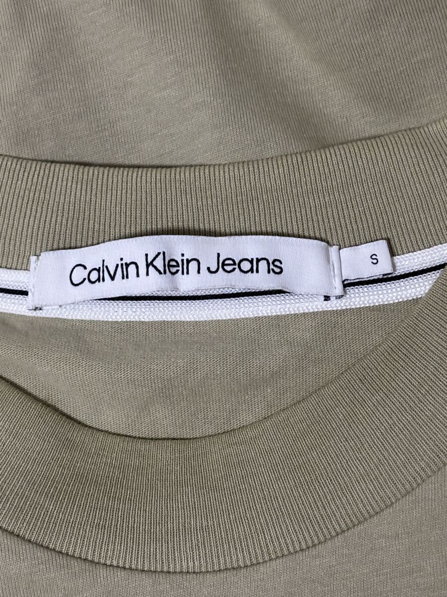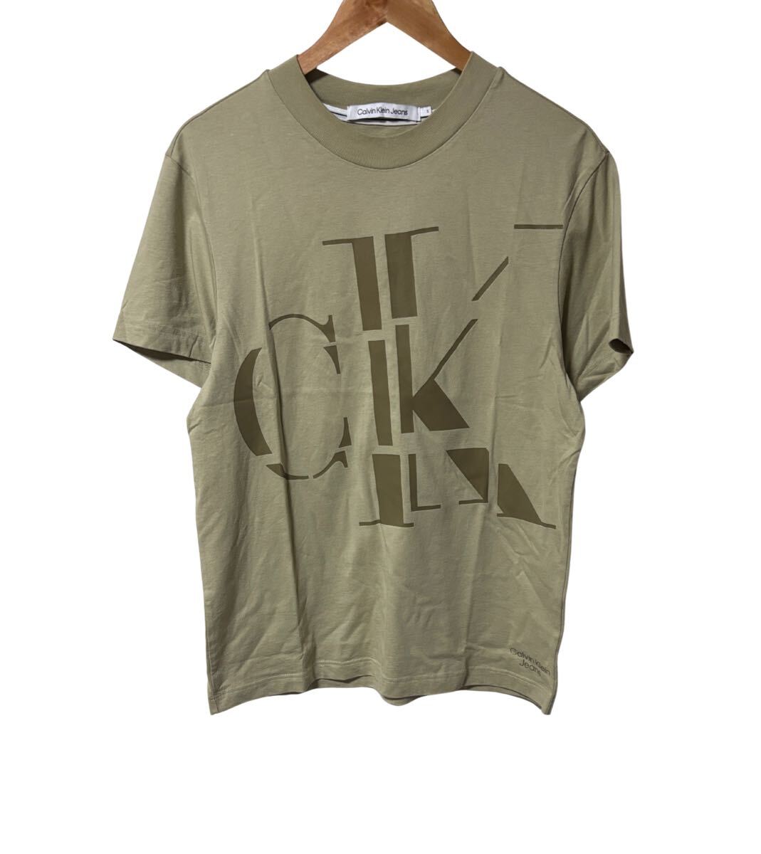 デザインは、フロントに大胆にあしらわれた CKロゴのグラフィックプリント が特徴的。ロゴが分割され、アーティスティックに配置されたデザインは、ブランドらしい都会的な洗練さを表現しています。ベースカラーはカーキで落ち着いた雰囲気があり、大人のカジュアルスタイルに自然に溶け込みます。ロゴ部分は光沢感のある加工が施されており、シンプルながら存在感のある仕上がりになっています。