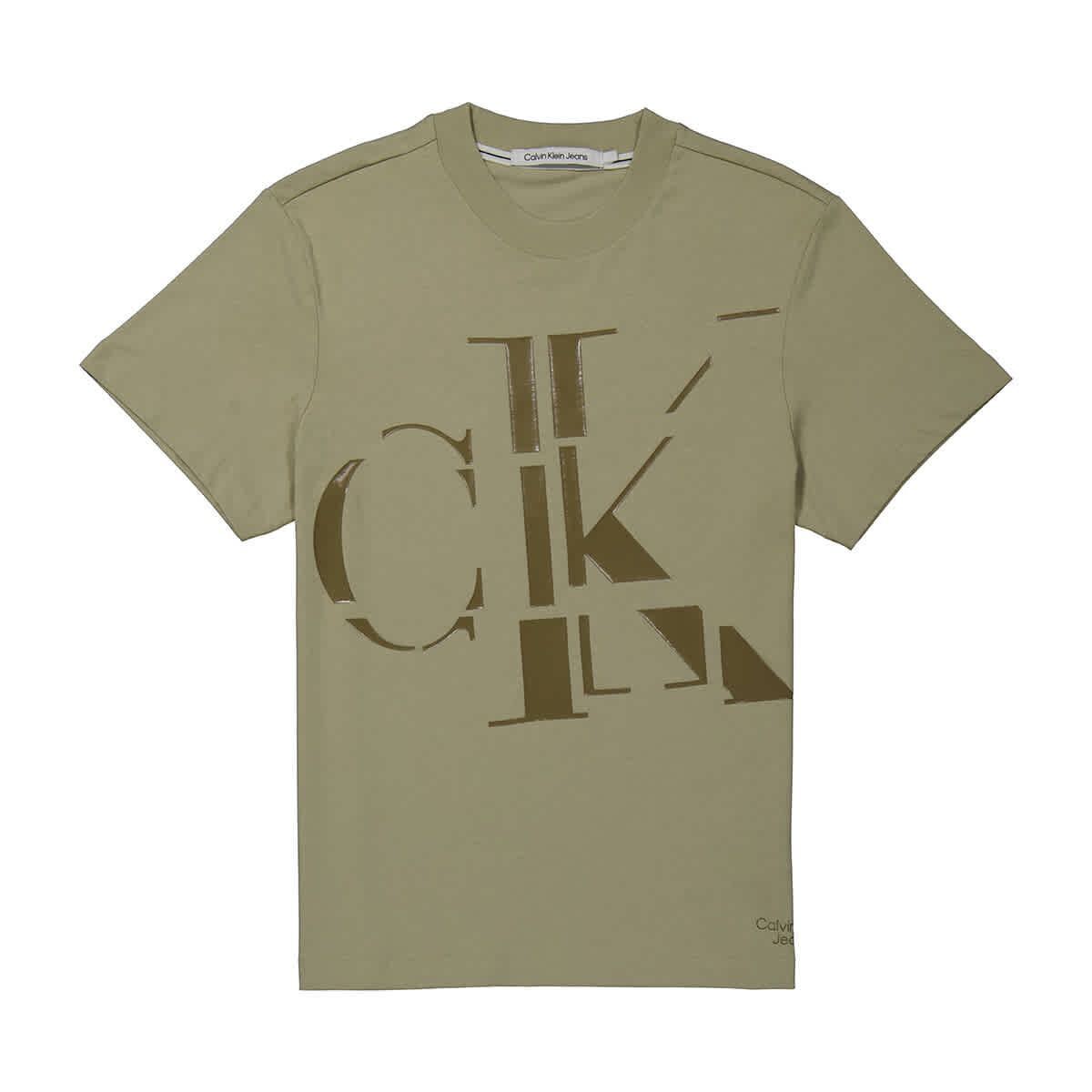 The standout feature of this T-shirt is the graphic CK logo print across the front. The fragmented, geometric arrangement of the logo creates an artistic effect that is distinctly urban and contemporary. The khaki base color adds a subtle, refined tone, while the glossy finish on the logo print provides a unique touch that elevates the overall design.
