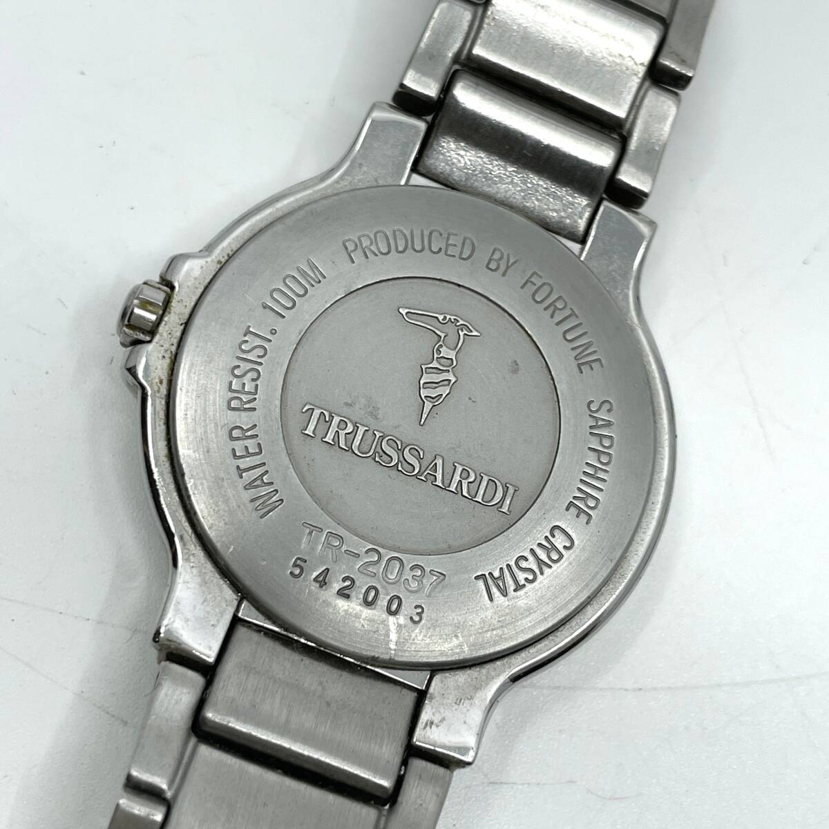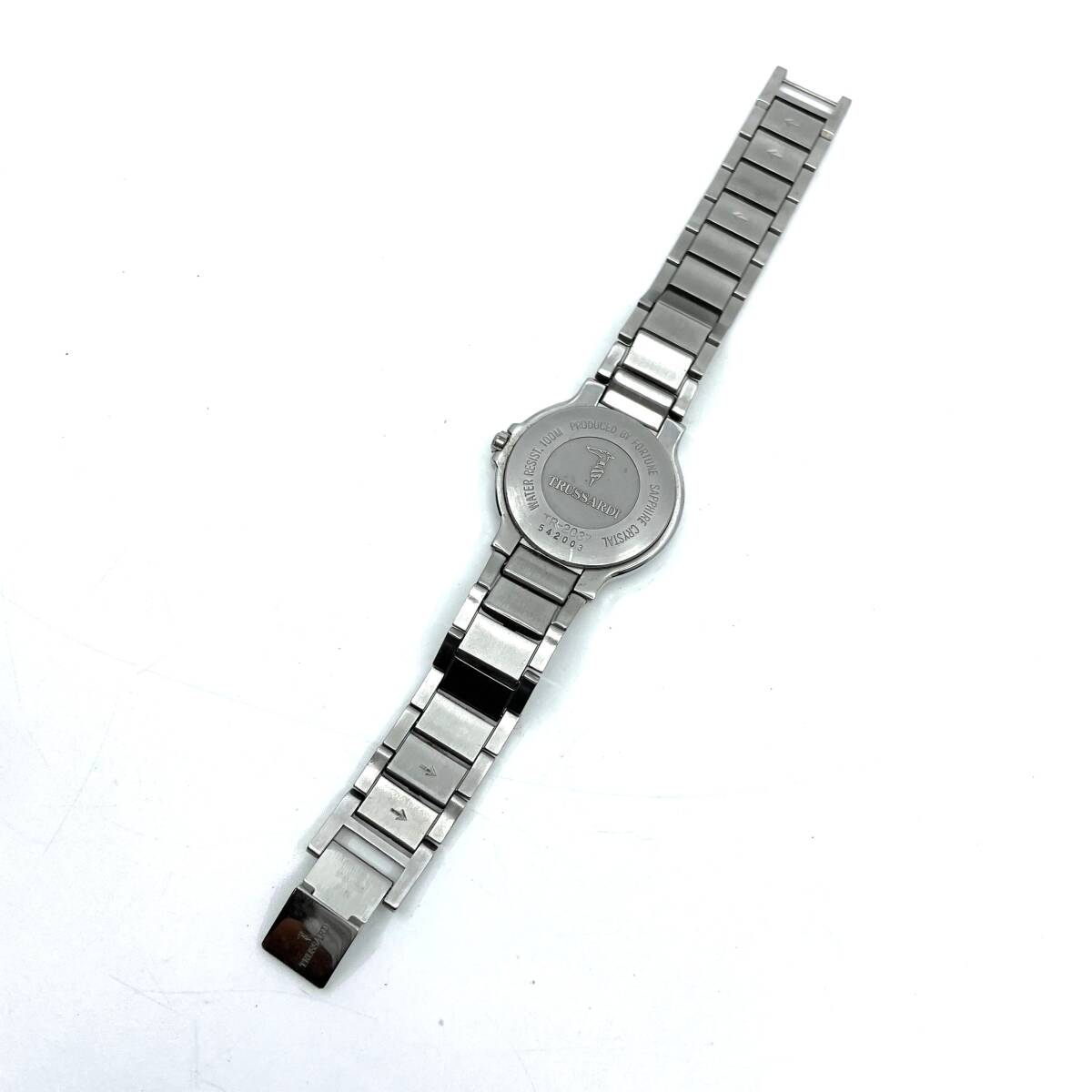 【動作未確認】TRUSSARDI トラサルディ クォーツ 腕時計 白文字盤 5針 デイト シルバー ローマン ラウンド 金属ベルト TR-2037