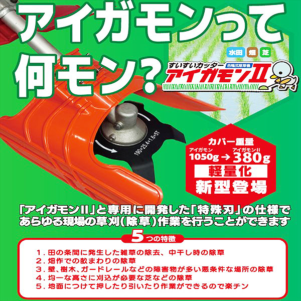 | ■商品名:hiraki すいすいカッター アイガモンII 刈払い機用 アタッチメント ■付属品:本体カバー ナット付取付金具×2 蝶ネジ×4 ワッシャー×4 L型5枚刃×1 8枚刃チップソー×1 ■取り付け機種:竿系24~26センチの草刈機(刈払機) ※ギアの先端が可変式のものには取り付けができません ■お持ちの草刈機に取り付けるだけ! 掃除機を押すような感覚で作業できます ■水田以外でもご使用いただけます ■ご使用の際は商品記載の取扱説明をよくお読みになりご使用ください。 ■その他の草刈機のナイフや耕耘爪は ご覧頂けます。■他にも新品の修理パーツ多数取り扱っております ⇒コチラから ■お使いのモニターや照明器具等で実際の色とは若干異なって見える場合もございます。多少の誤差はお許し下さい。 ■写真に掲載のもの以外は原則付属致しませんのでご注意下さい。 |