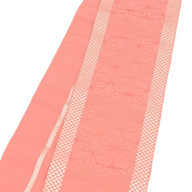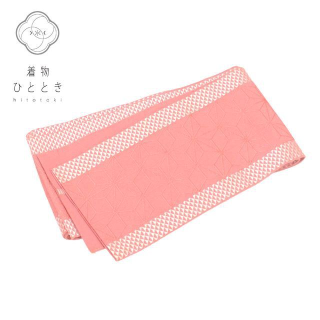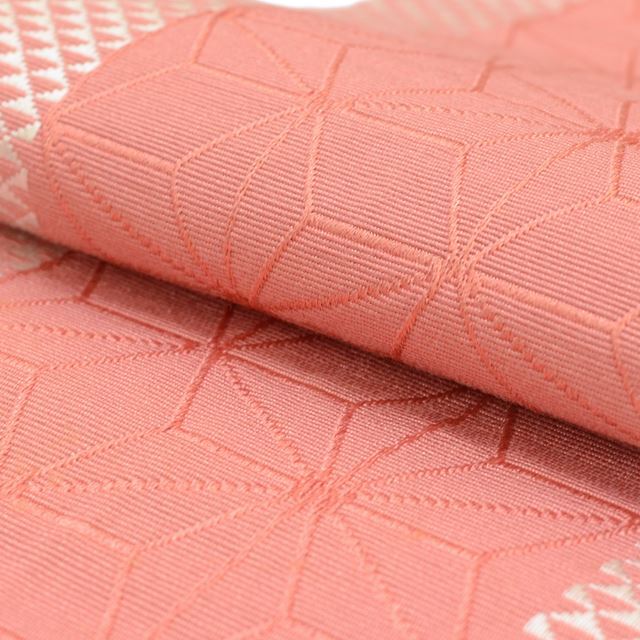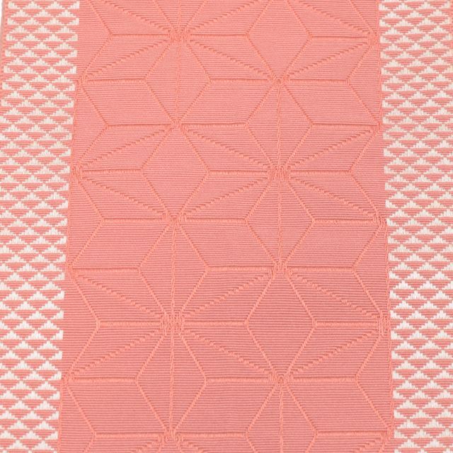 渋ピンク色に麻の葉文様が施された、お洒落なリサイクル半幅帯です。
