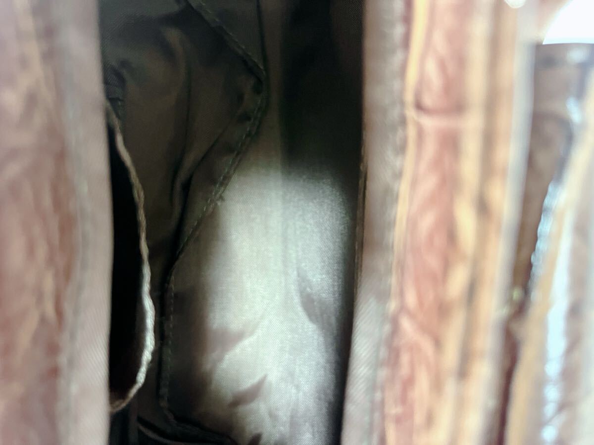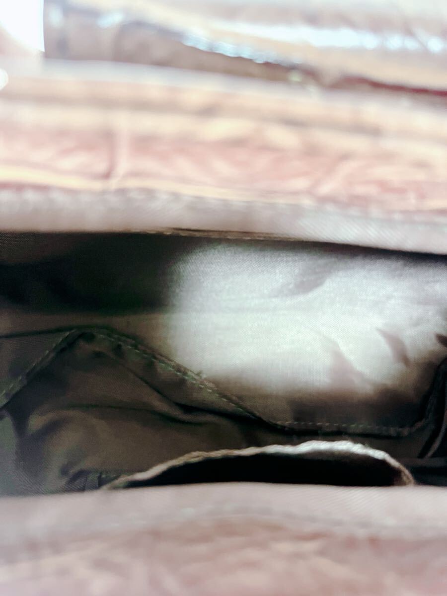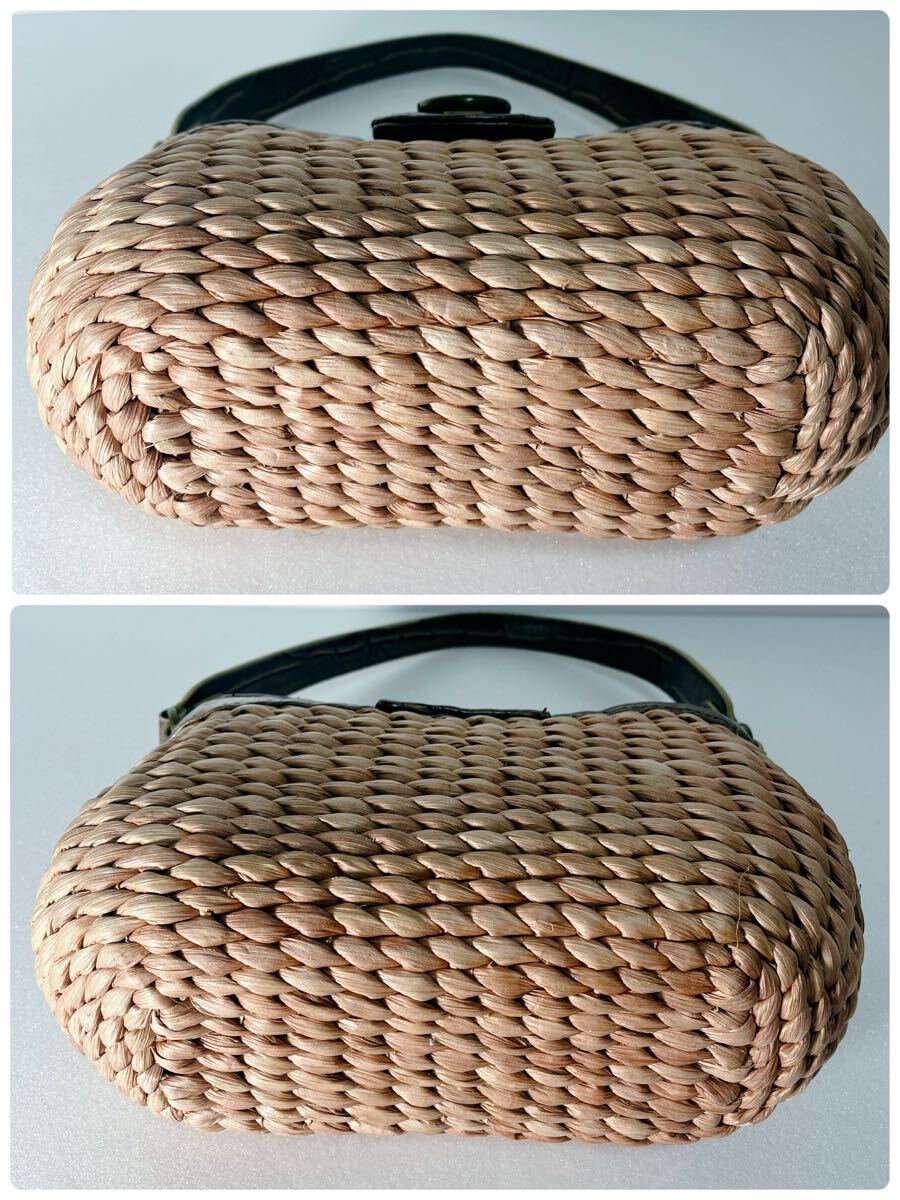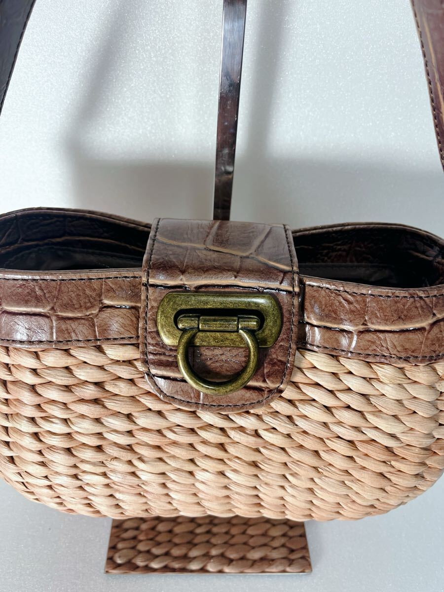 ナチュラルな編み込み素材にブラウンのクロコ型押し風レザーを組み合わせた、高級感のあるハンドバッグです。