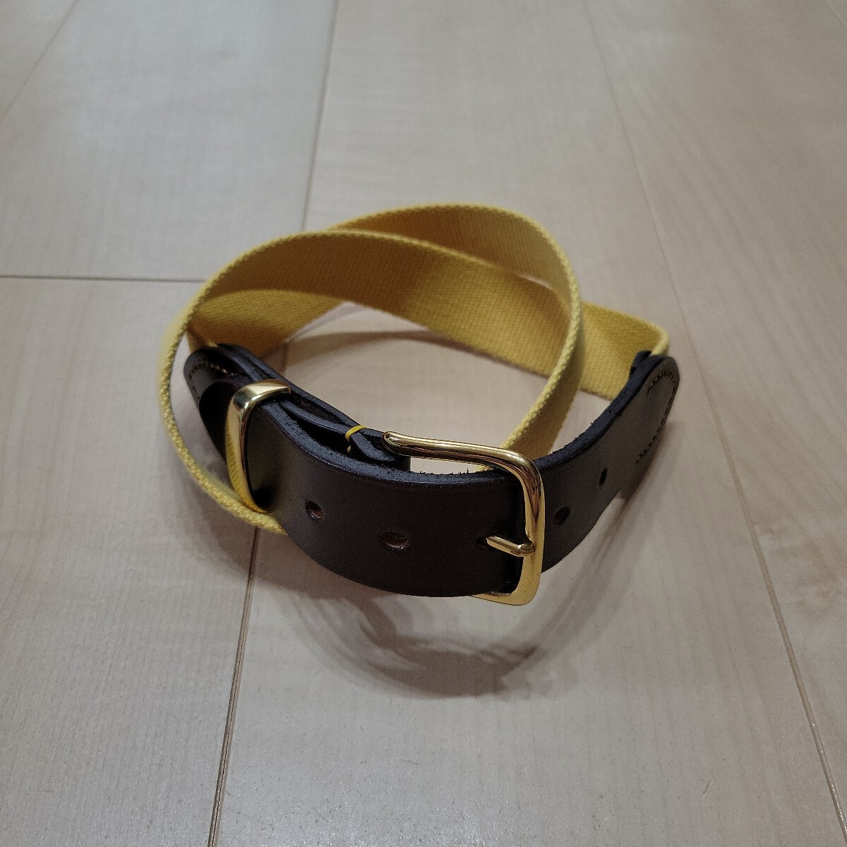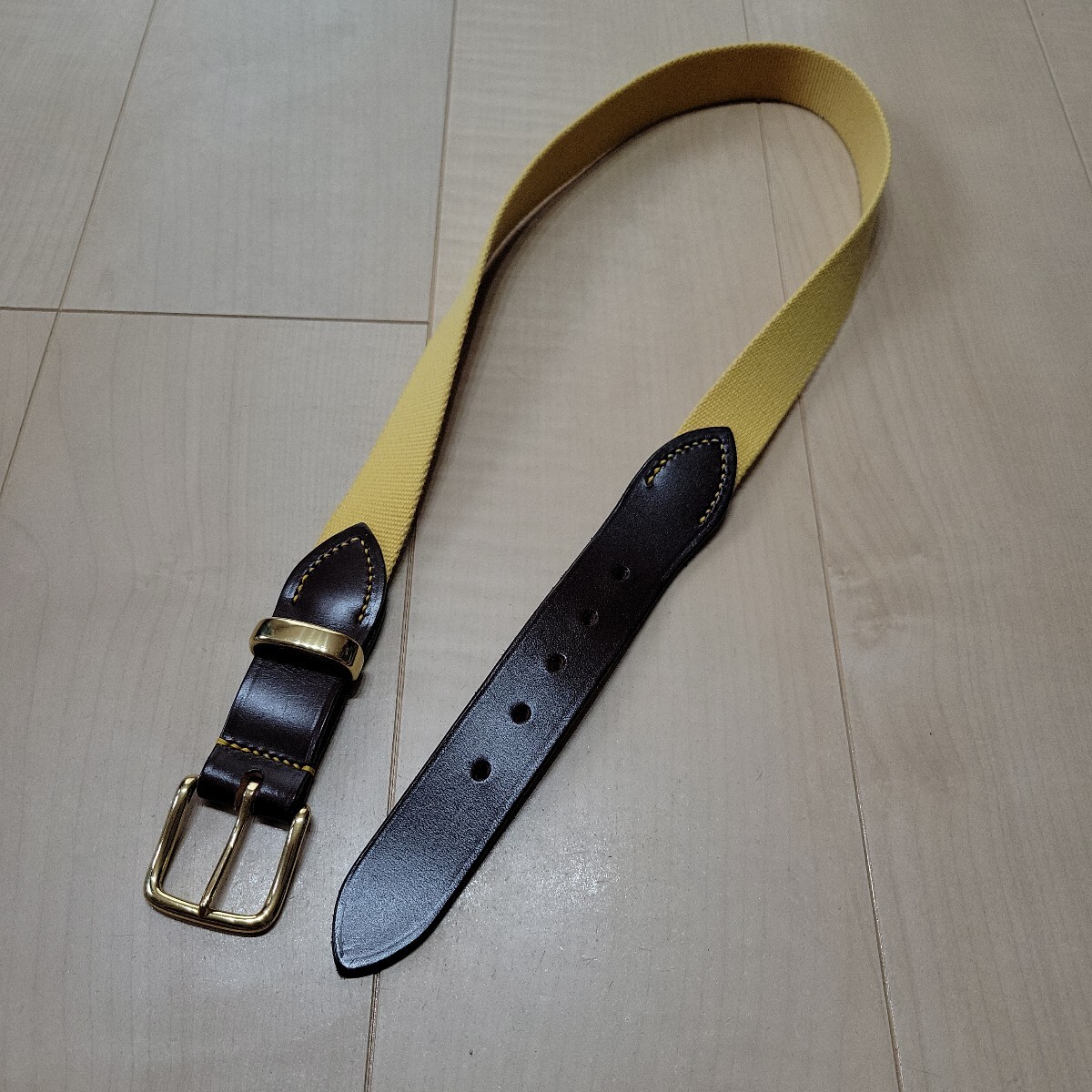 強い耐久性と美しい光沢を持つブライドルレザーをバックル部分とベルトホール部分に使用。厚みのあるキャンバス地。フレームとベルト通しにはブラスを使用しています。キャンバス地は非収縮性のウェビングとなっています。