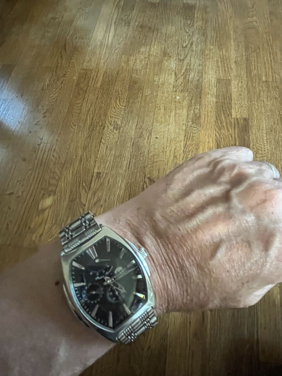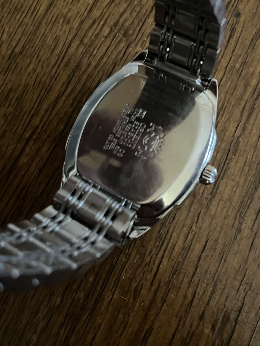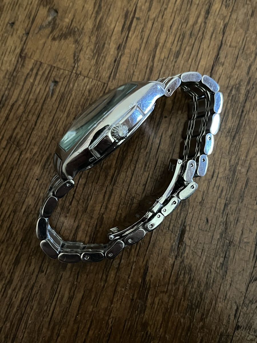 Orient オリエントトノー型腕時計です。かなり前の時計になりますが問題なく稼働品です。12時位置が40時間リザーブ計、6時位置がスモールセコント、9時位置が日付となります。リューズ一段引きで日付変更、二段引きで時刻変更です。オリエントトノー型は形も個性的で、また海外でも人気のものです。ドーム型ガラス風防に傷があります。ご納得いただける方のご入札をお待ちします。