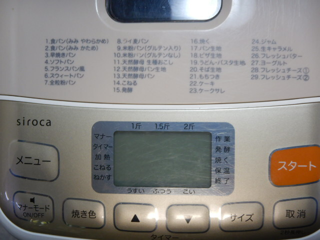メニュー 1.食パン(みみ やわらかめ)/ 2.食パン(みみ かため)/ 3.早焼きパン/ 4.ソフトパン/ 5.フランスパン風/ 6.スウィートパン/ 7.全粒粉パン/ 8.ライ麦パン/ 9.米粉パン(グルテン入り)/ 10.米粉パン(グルテンなし)/ 11.天然酵母生種おこし/ 12.天然酵母パン生地/ 13.天然酵母パン/ 14.こねる/ 15.発酵/ 16.焼く/ 17.パン生地/ 18.ピザ生地/ 19.うどん・パスタ生地/ 20.そば生地/ 21.もちつき/ 22.ケーキ/ 23.ケークサレ/ 24.ジャム/ 25.生キャラメル/ 26.フレッシュバター/ 27.ヨーグルト/ 28.フレッシュチーズ(室温25度以上)/ 29.フレッシュチーズ(室温24度以下)