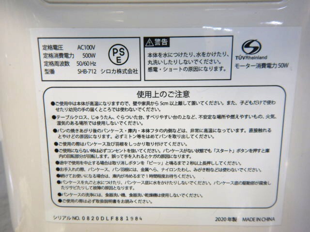 2020年製 シロカ SHB-712 全自動 ホームベーカリー 2斤 W26D36H31cm 4.15kg パン焼き機