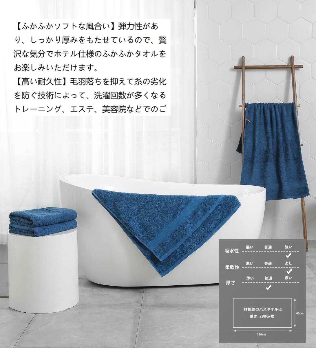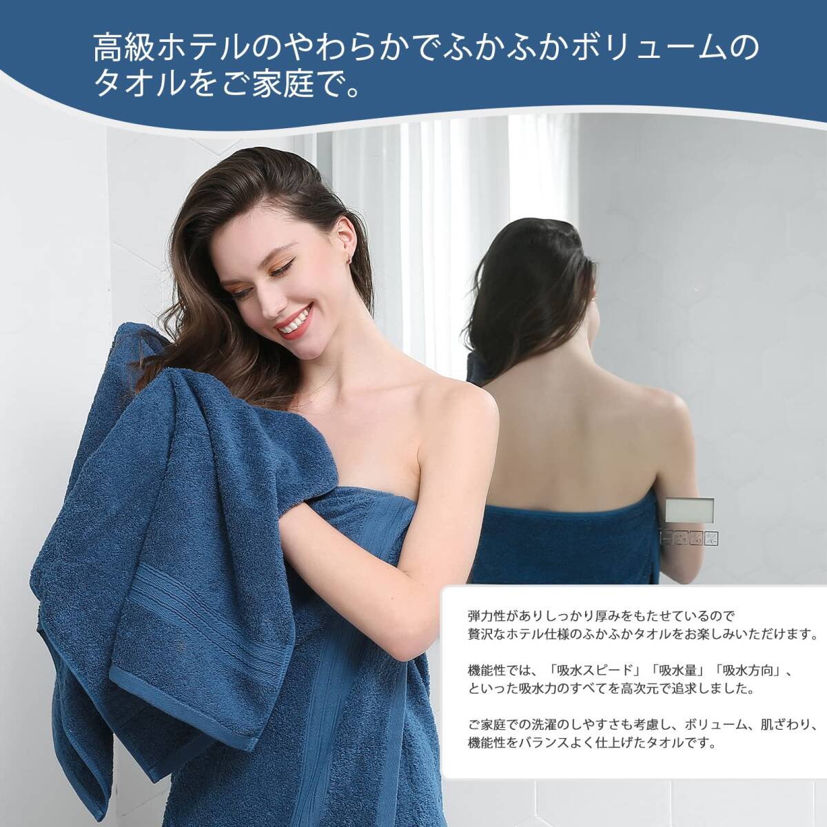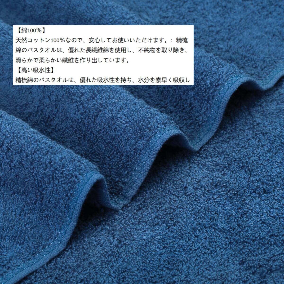 【高い吸水性】:精梳綿のバスタオルは、優れた吸水性を持ち、水分を素早く吸収し、お風呂やシャワー後に快適なドライな肌触りを実現します。お風呂から上がったときに、しっかりと水分を吸収してくれます。また、水泳後や運動後など、汗をかいたときにも、速乾性が高いため、すぐに乾かすことができます。