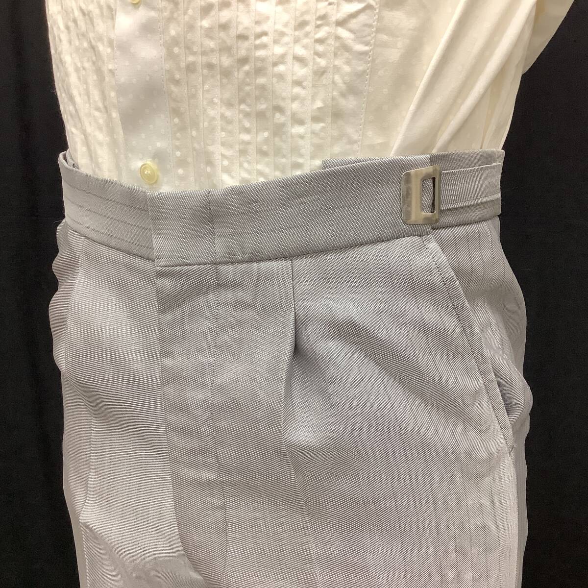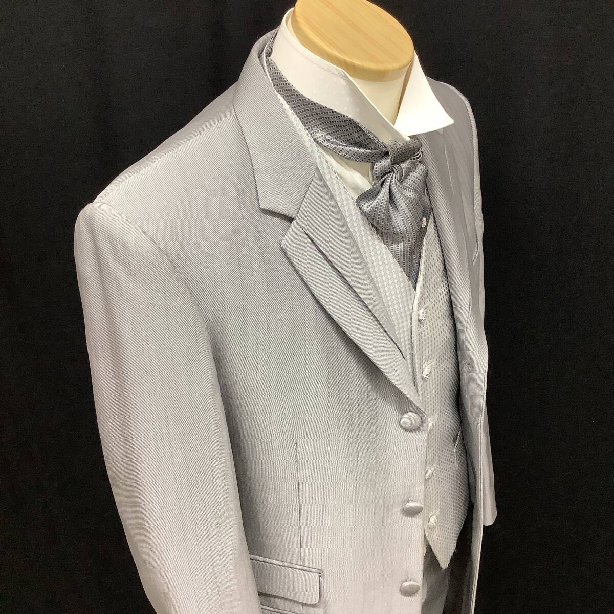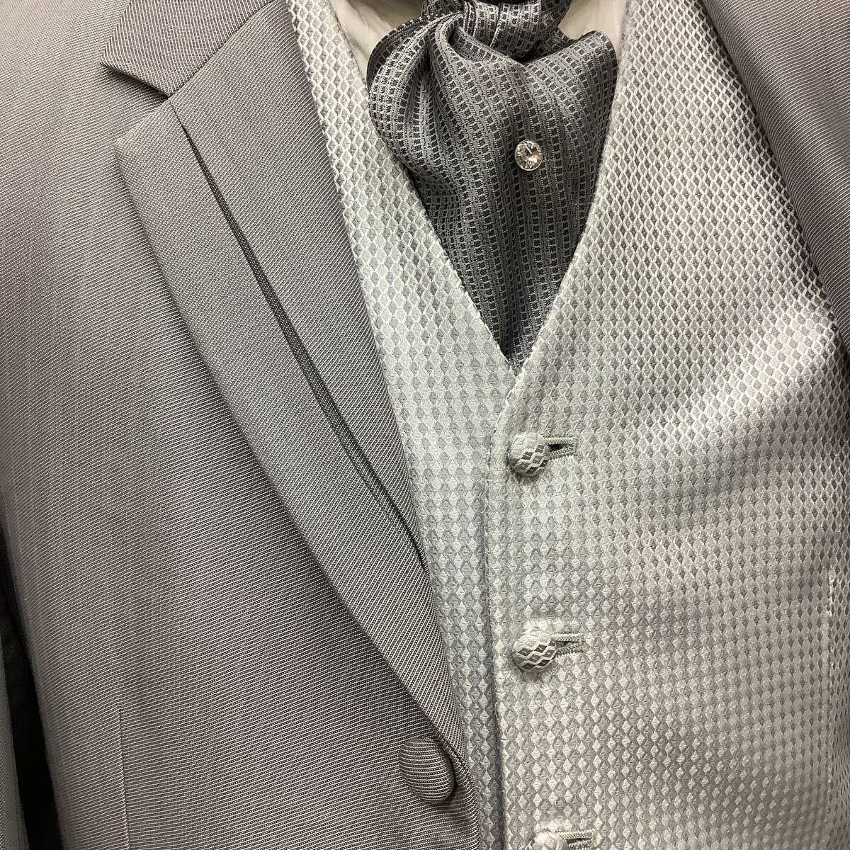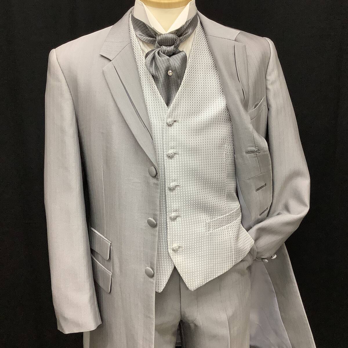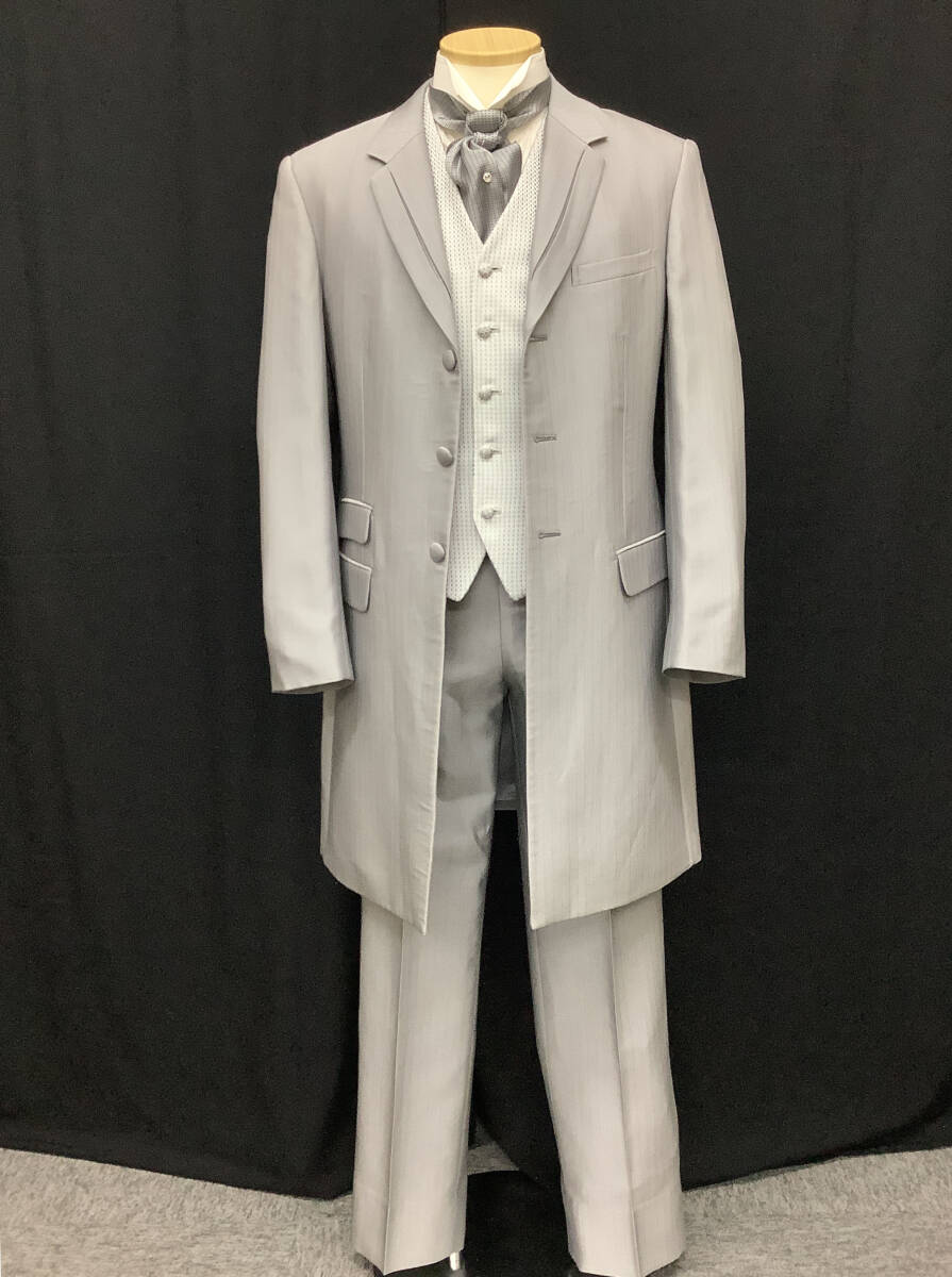 Y-LL★ライトグレーのシャドーストライプ★クラシカルなロングタキシード、シルバーグレーの細かな柄ベスト、グレータイ付 レンタル衣裳店で使用・手入れされていた新郎用タキシード 専門店で管理されていた衣裳ですので状態は良い方です メンズメーカー「マツオ」の商品、表示サイズはY-LL 上衣・べスト・パンツのスリーピースとタイのセット 色は明るめグレーで、シャドーストライプ 上衣は剣衿、下衿中央はボックスになっていて割れているように見えるデザイン 両脇のポケットは飾りでフラップ付、右側には2ヶ、背はセンターベント 前袷・袖口には包みボタン、前は3ヶ袖口は3ヶづつ、背中央にも飾りボタン ベストは白に近いシルバーにグレーの細かな菱柄、両脇にポケット付 5ヶのボタンは共生地の包み 上衣と共生地のパンツはタックがひとつ、ウエストはアジャスター付きでサイズ調節可能 タイは細かな柄の濃いめグレーで中央にクリスタルピン付き ワンタッチの着脱式 【注意】写真のYシャツはセットではありません 写真は同型の別タキシードのものを利用、色デザインとも同じです モニター等により色合いが多少違っています、ご了承下さい 【寸法】Y-LLサイズ 173254 実寸法と計測方法は以下の通りです 着用される方のスーツ等で寸法を確認してください 計り方で多少の誤差が出ると思います 上着丈95cm位 袖丈64cm位 肩巾46.5cm位 ウエスト75~91cm位 股下86cm位 【計測方法】 肩巾・・・背中側の左右の袖の縫いつけを直線で計測 袖丈・・・袖の縫いつけから袖口までを真下で計測 上着丈・・・衿の縫い目から裾までを計測。 ウエスト・・・パンツの内側の周囲を計測 股下・・・・股の付け根から裾までを真下で計測 ※ヌード寸法ではありません。現品を当方で実測しています 【状態について】 特に目立つような汚れやシミ等はありません 全体的にはきれいで良好な状態です ただ、あくまでも貸衣裳で使用していた中古品です ご了承の上でご入札お願いいたします | |||