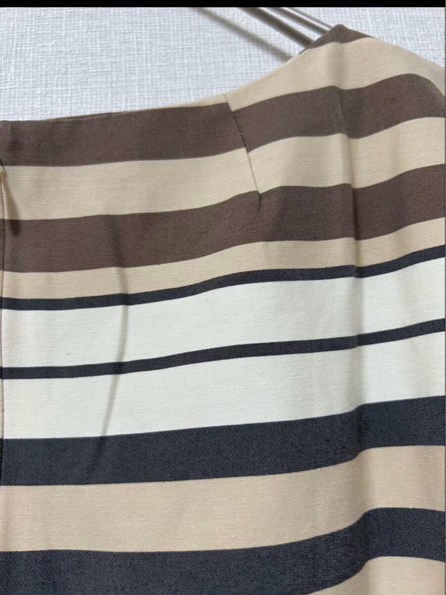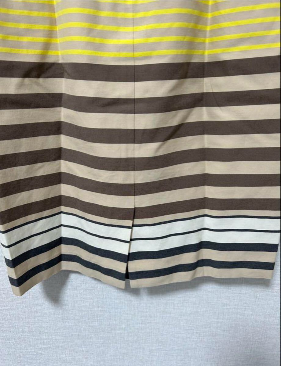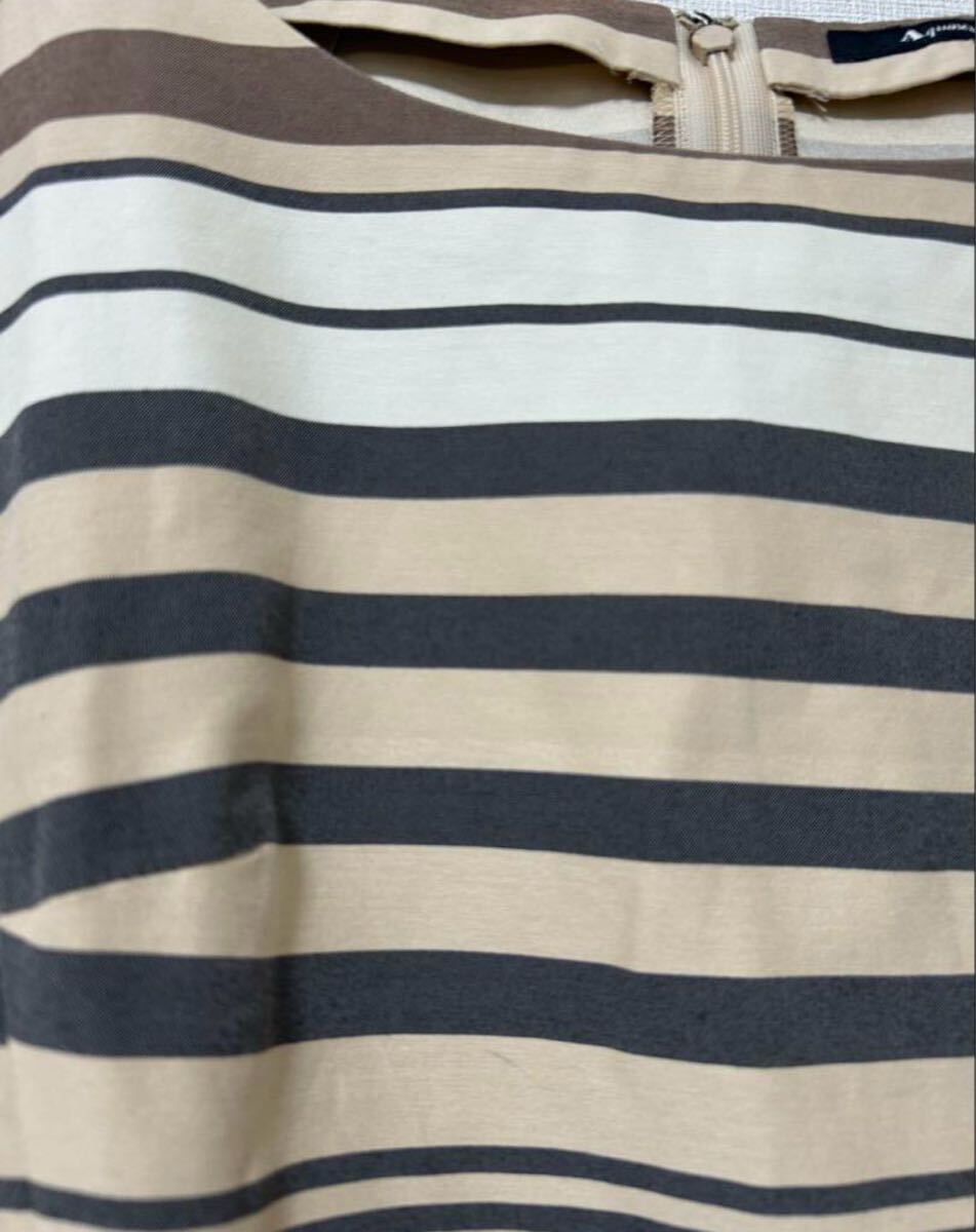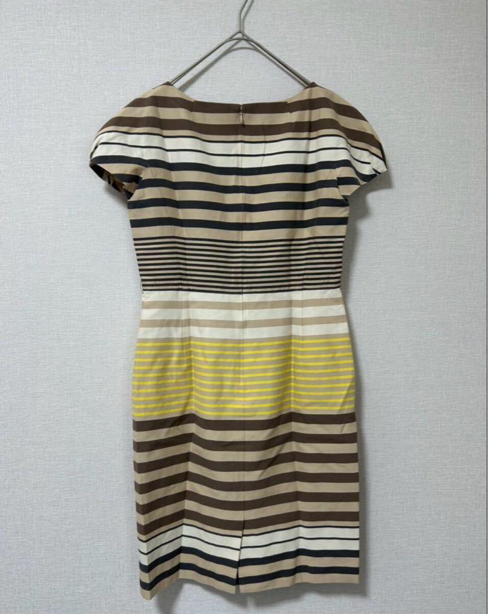 ストライプデザインの半袖ひざ丈ワンピース、ブラウンとイエローの配色が特徴。