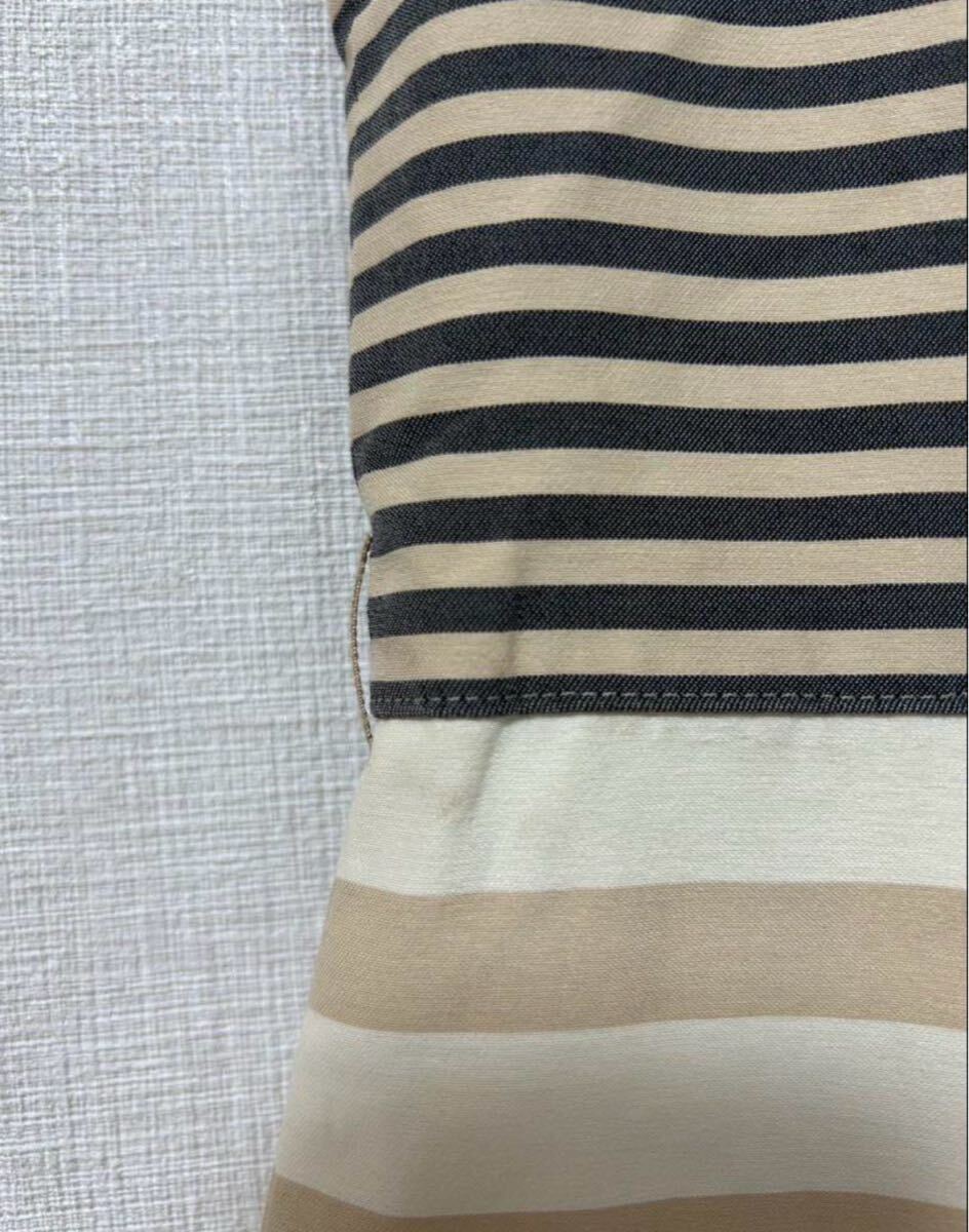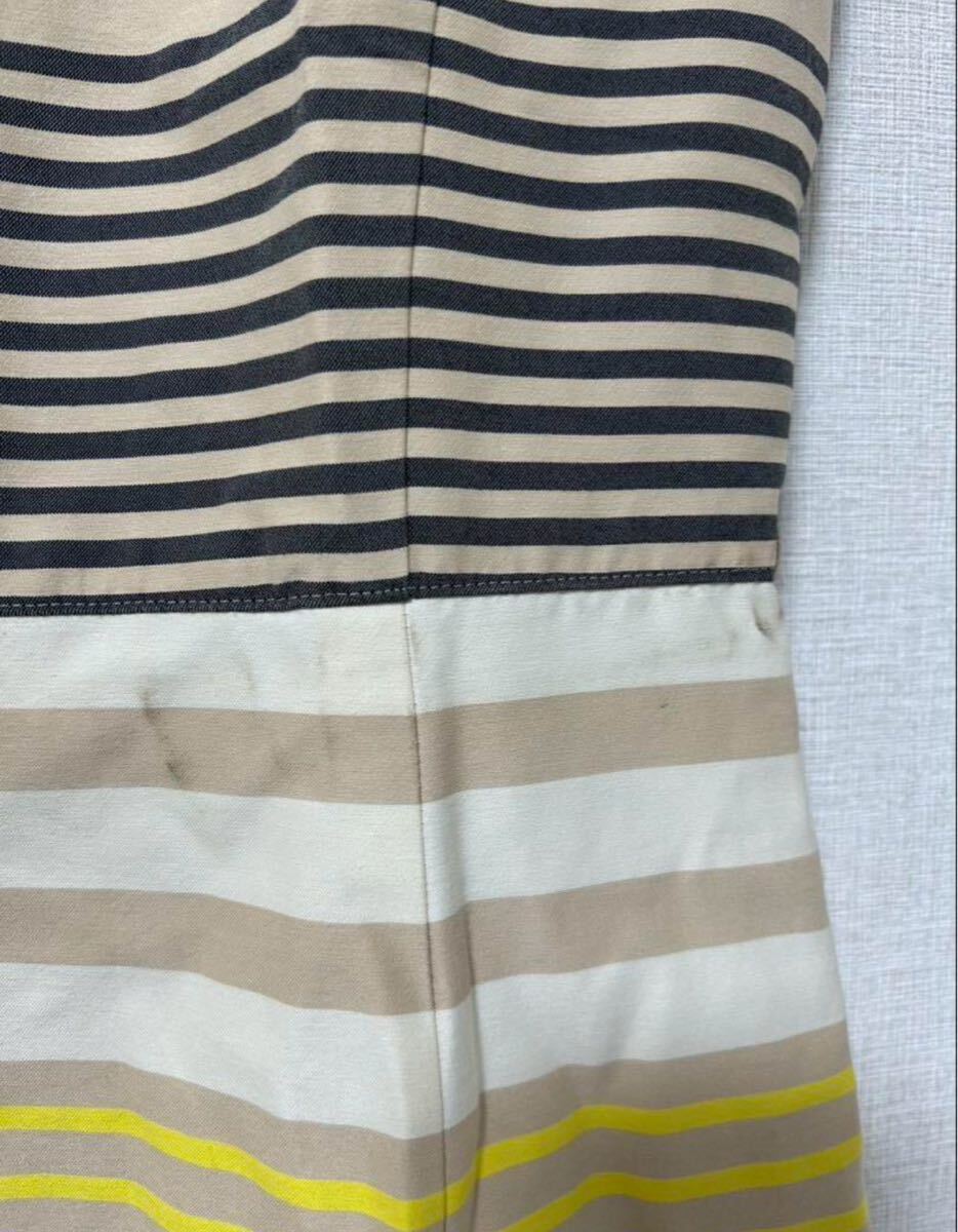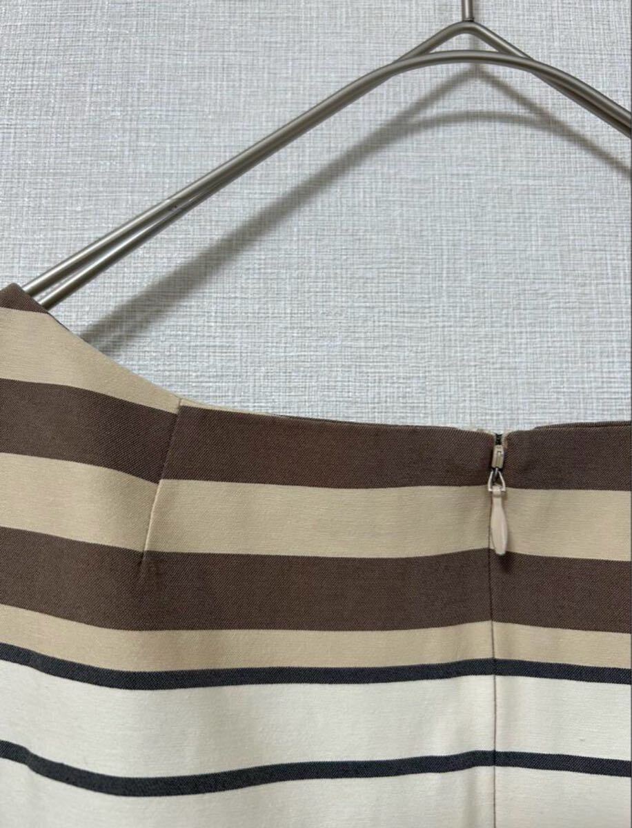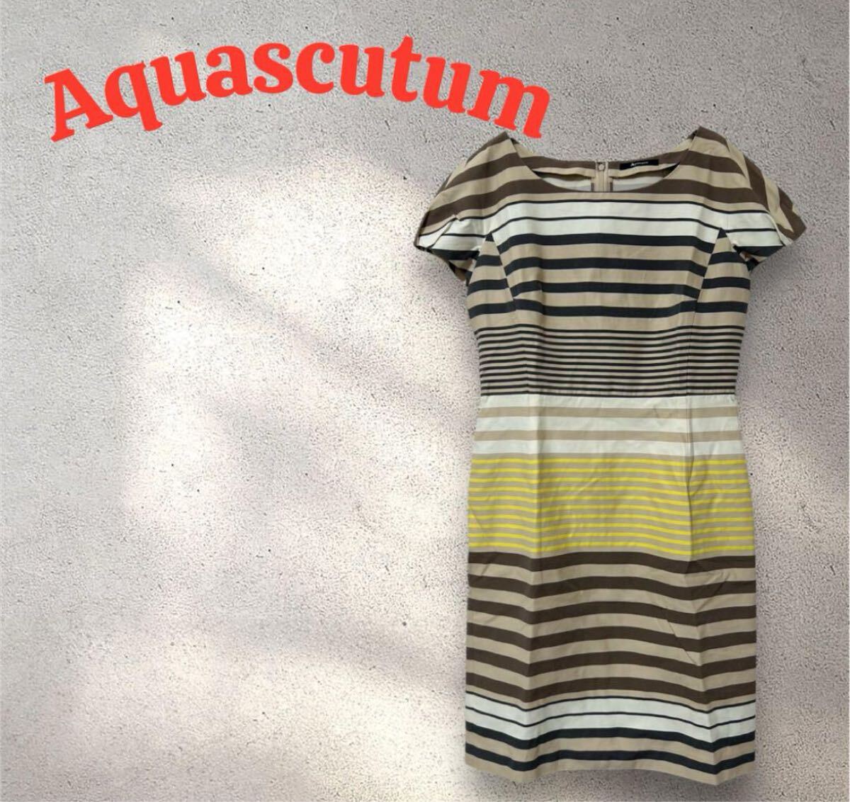 ストライプデザインの半袖ひざ丈ワンピース、ブラウンとイエローの配色が特徴。
