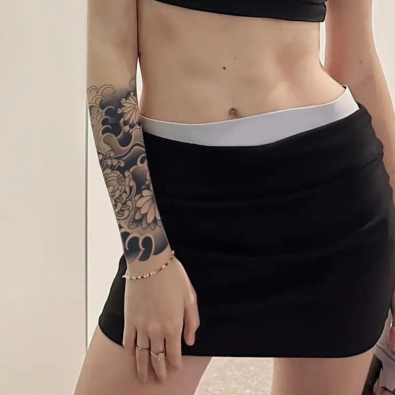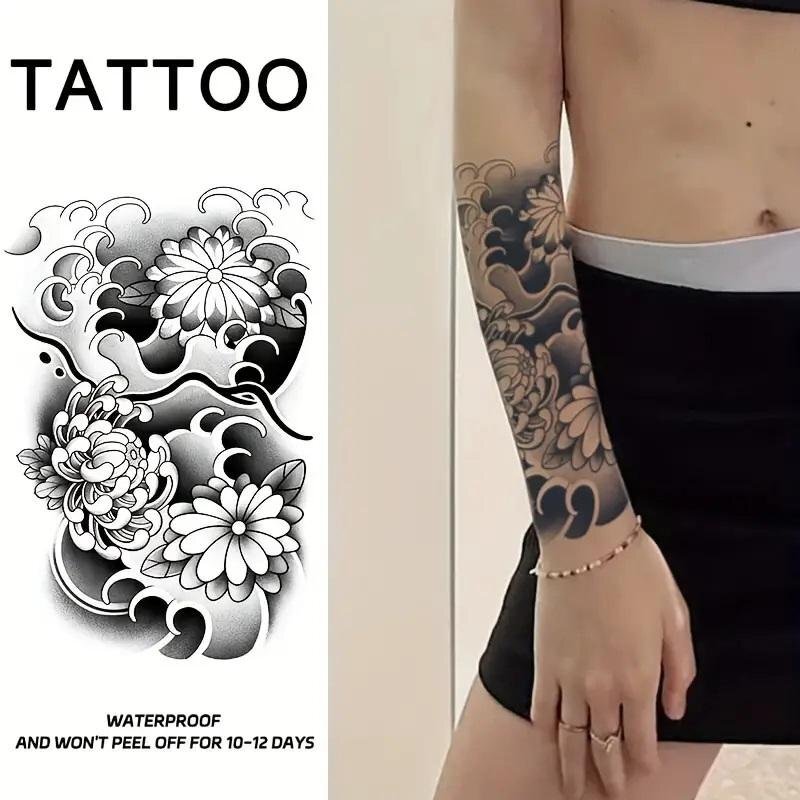 | 台紙サイズ 約 17cm×24cm 手首から肘、膝下から足首までサイズのタトゥーシールです。 ※敏感肌、目の近く、または接着剤にアレルギーがある場合は使用しないでください。 【使用方法】 ●透明フィルムを剥がし、スプレーまたは濡れタオルでステッカーをしっかりと濡らして下さい。 ●10秒間、肌に密着させ、ステッカーを剥がします。その後約2時間濡らさないで下さい。 ●約、6時間後に発色開始→約24~48時間程度で完全発色します。 ●約1~2週間持続します。 【貼る時のコツ】 シートそのままの大きさだと曲げ辛く密着しにくい為、余白部分を切ってから貼るのがコツです。 ※商品画像の色味は画面でみた場合と実際は多少の色差が生じる場合がございます。 ※海外製品のため入荷時点でしわや折れ目が付いている場合がございますが、ご使用には問題ございませんので予めご了承ください。