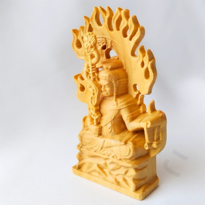 密教における明王の一尊で、大日如来の化身とされています。忿怒相という恐ろしい形相ですが、これは煩悩や悪を打ち砕くための力強い姿を表しています。また、右手の剣で人々の煩悩を断ち切り、左手に羂索という衆生を救済するための縄を持っています。不動明王の周りの炎は、煩悩を焼き尽くす炎であり常に燃え盛っています。悪を退散させる慈悲深い仏様です。