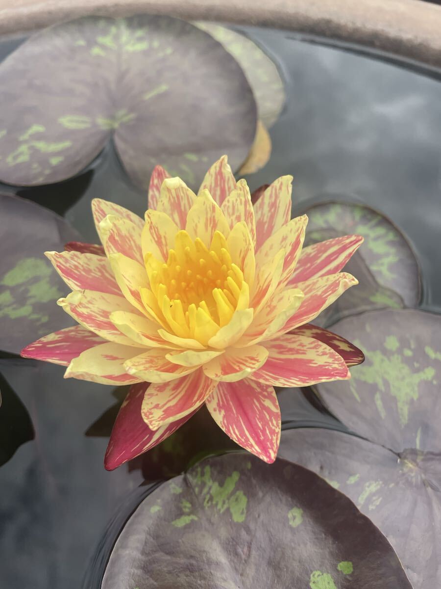 ご覧いただきありがとうございます。耐寒性睡蓮、スイレン苗サイアムファンタジーのB出品です。黄と赤の斑が美しい睡蓮です。花はパラニーに似ていますが、こちらの方が葉の赤みが濃い品種です。