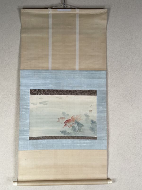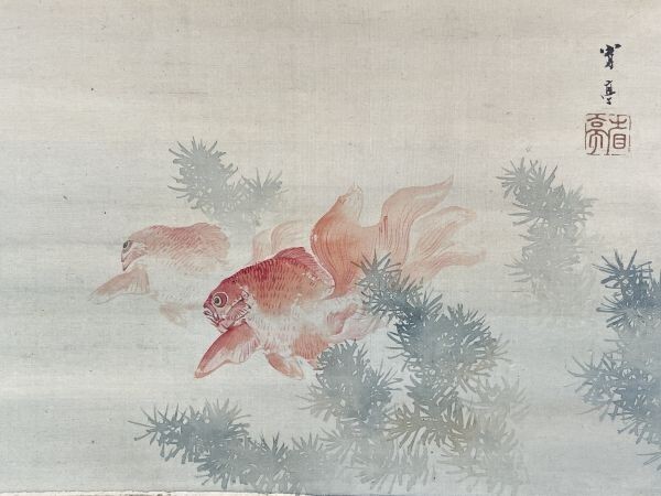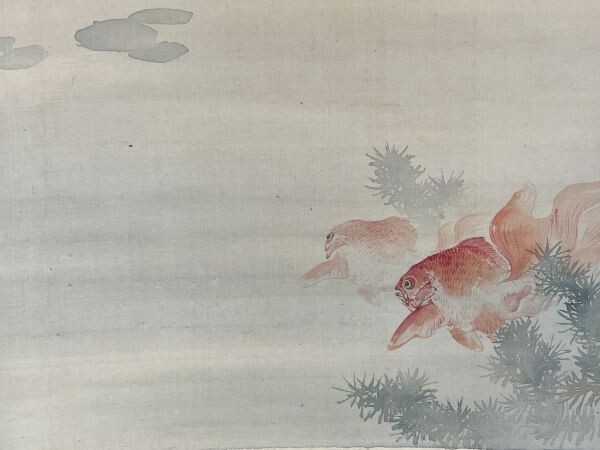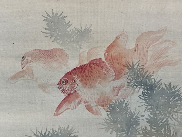 【真作】T》帝室技芸員 渡辺省亭 絹本 金魚の図 石河有隣箱書 K416ムネgv