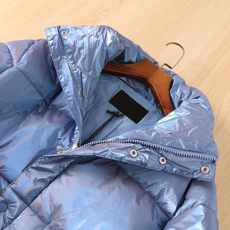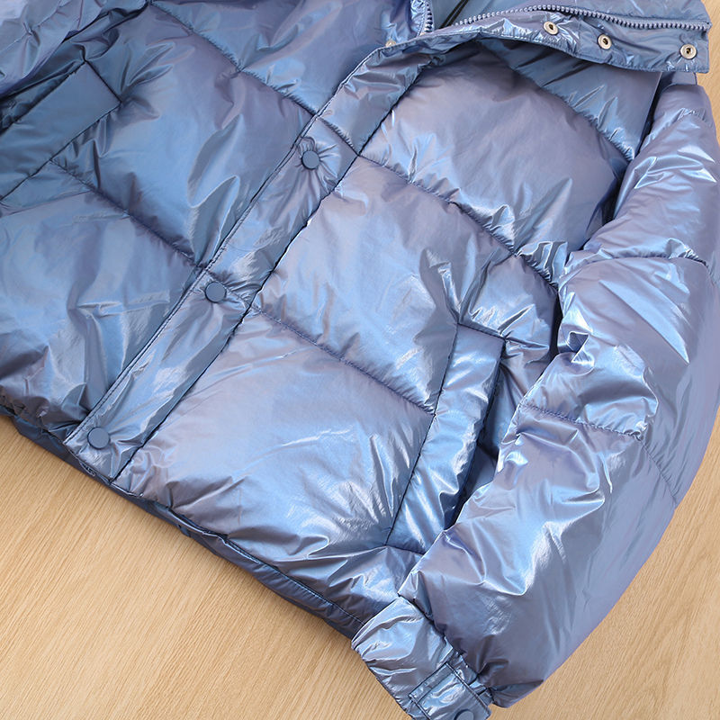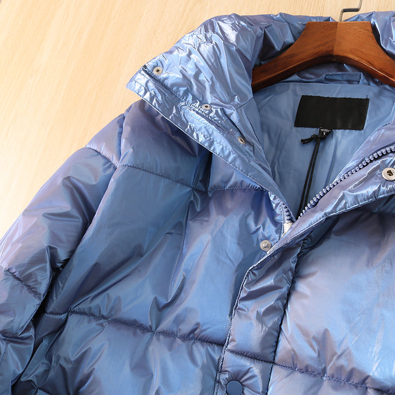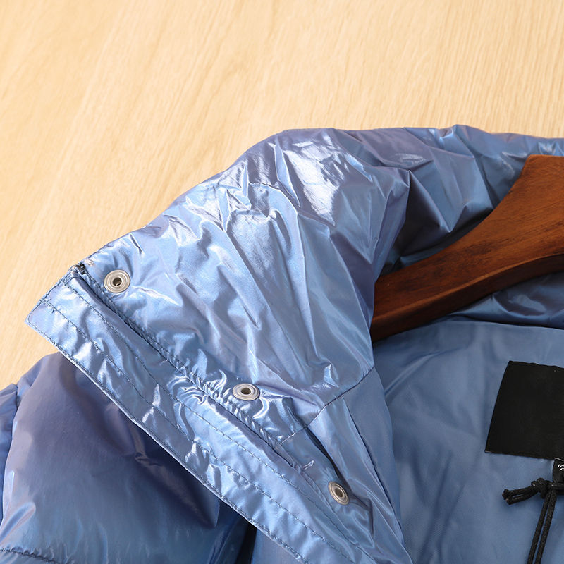 ・視線を惹きつける光沢素材仕上げ:光沢感のあるシャイニー素材が、光の当たり方によって美しく輝き、周囲と差がつくおしゃれな一着。夜間のコーデにも映える存在感。