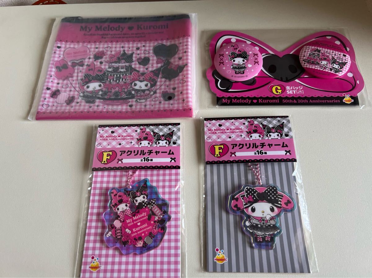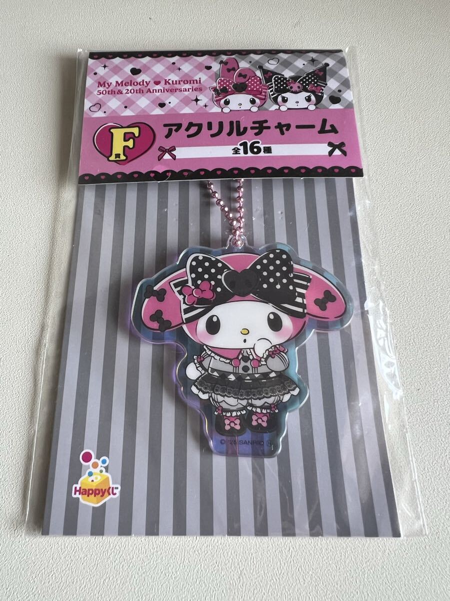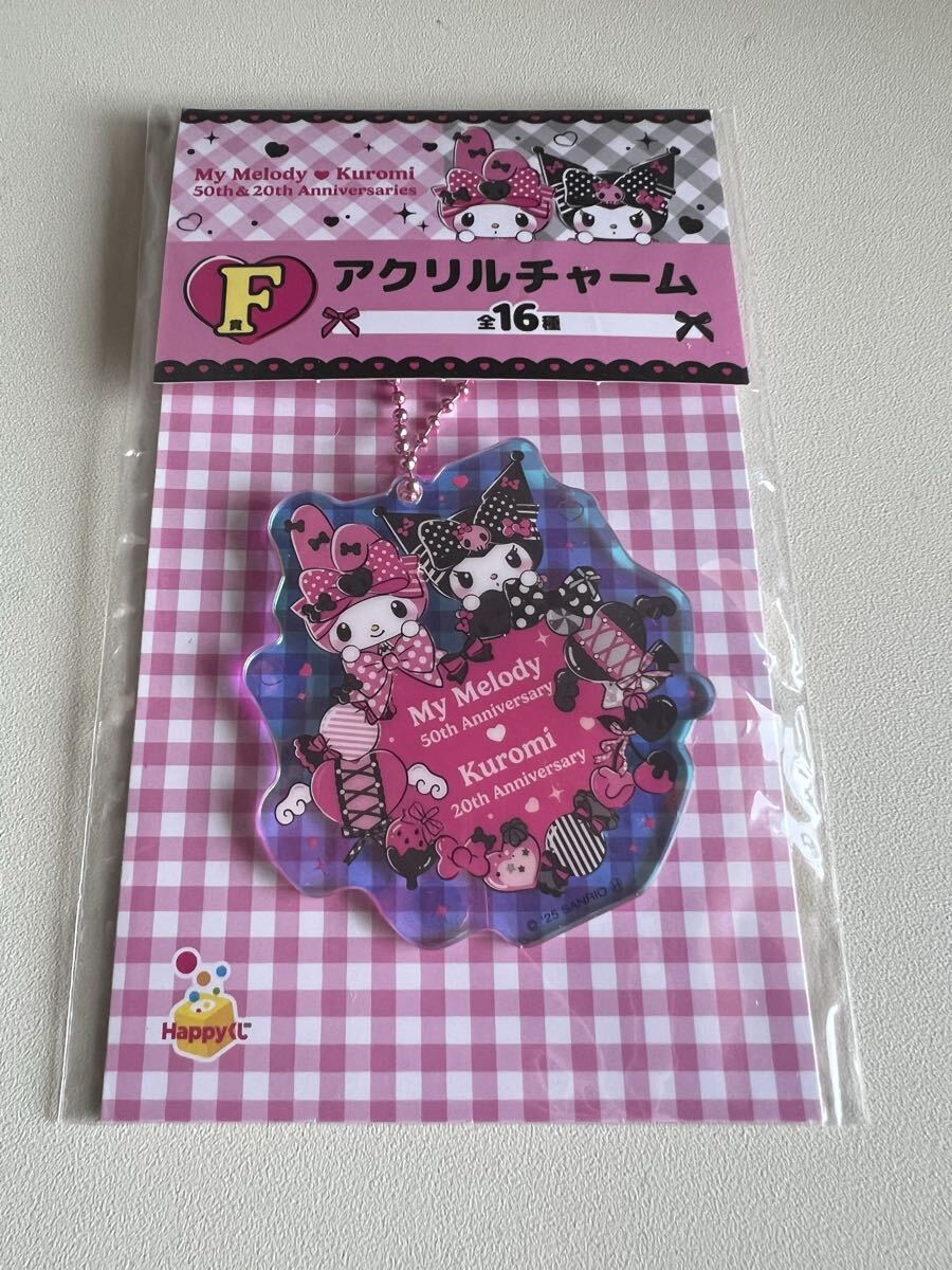 My MelodyとKuromiの50周年と20周年を祝うアクリルチャーム、全16種のコレクション。