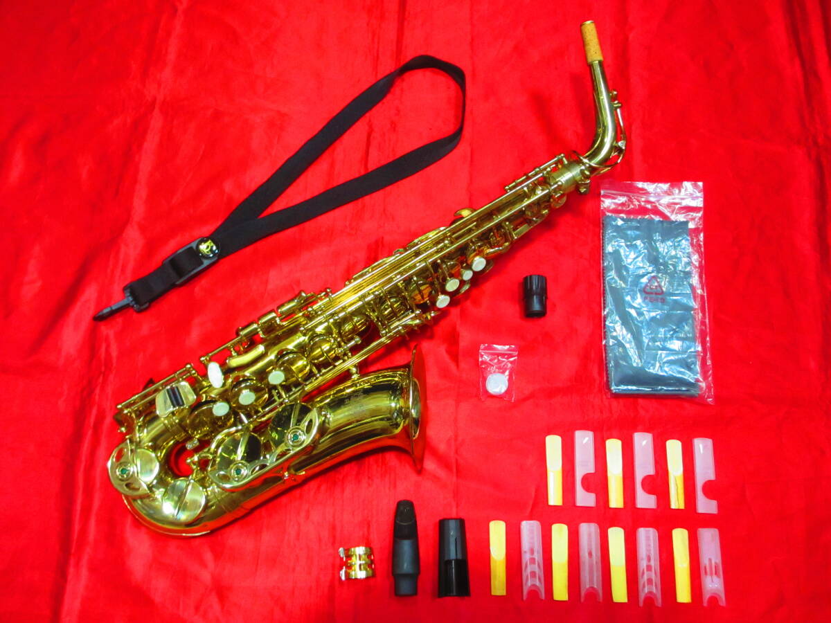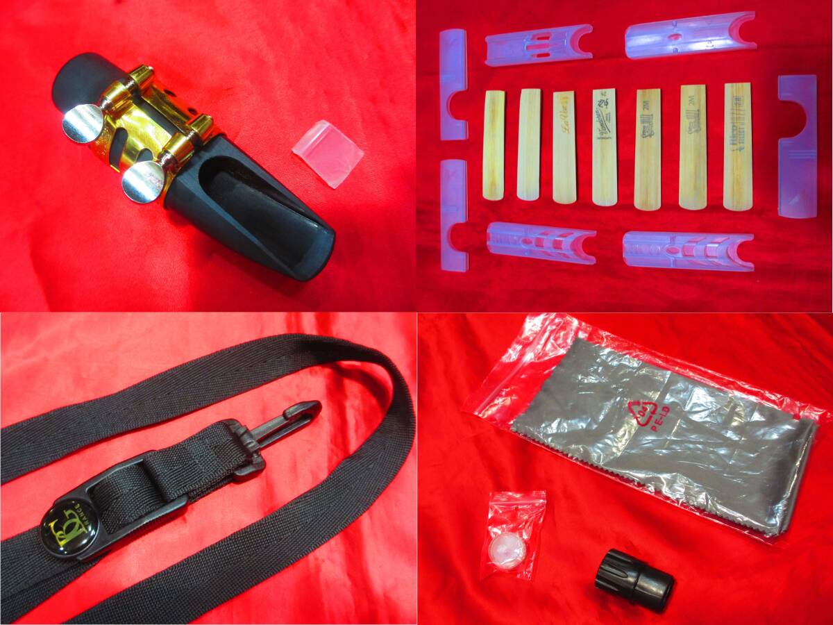 ・おまけとして、オリジナルマウスピース(CJカスタム、プレート付、マット仕上げ)、オリジナルブランドリガチャー(彫刻入り、クロームスクリュー新品)、BGタイププラキャップ(新品)、モニター用リード7枚(セレクトジャズ、ラ・ボーズ、バンドレン他新品)、マイクロファイバークロス(L版新品)が付いています。