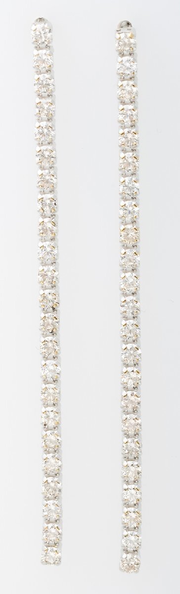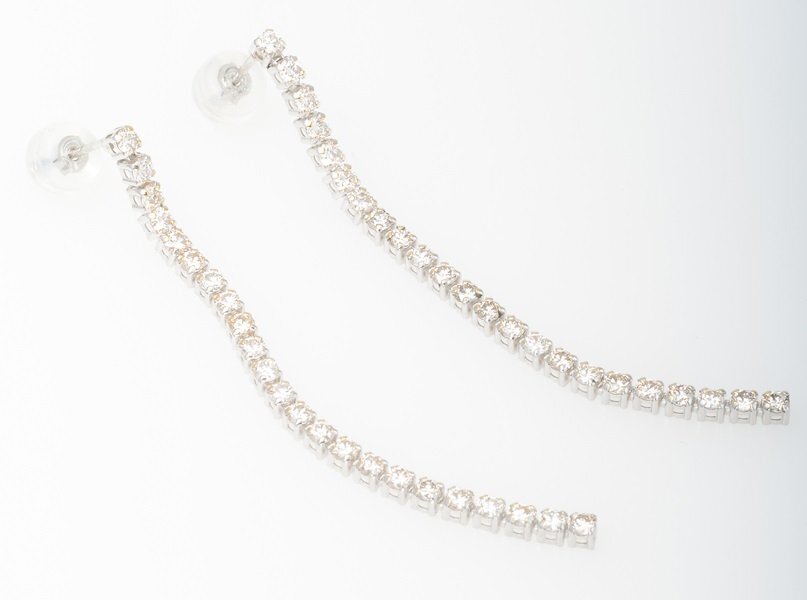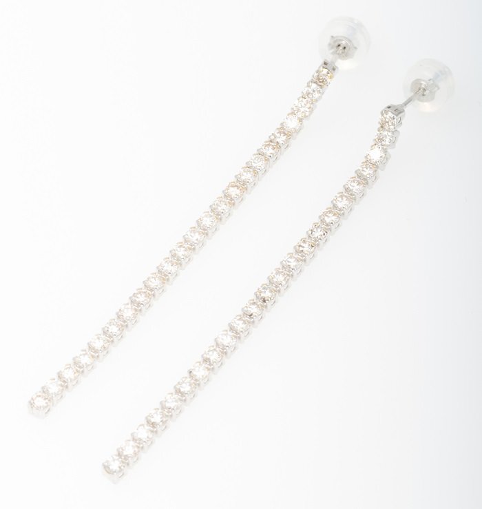 説明 | ホワイトゴールド(18金)の枠に、ダイヤモンド(方耳0.40ct、両耳合計0.80ct)が縦に連なるデザインです。 動きにあわせてスイングするピアスが、大人らしい上質さと、どこから見ても、誰に見られても可愛い魅力を素敵に演出します。 |