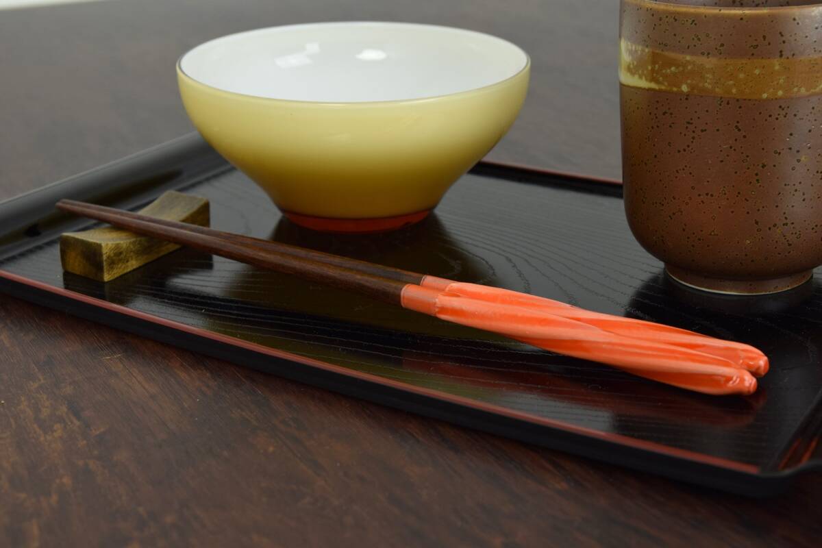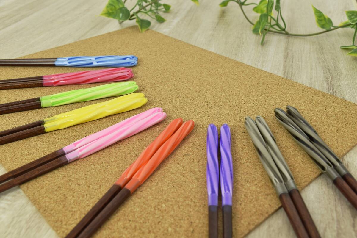 飴を伸ばしたような、液体から固体へと飴が変わる様子を再現したデザイン。 色鮮やかなカラーは食卓を華やかに。視覚的に楽しめる一膳。 持ち手の下から箸先は馴染みのある天然木で、箸先が細くはさみやすい。和ごころと遊び心がつまったお箸。 【お箸を選ぶ目安】 片手で人さし指と親指を90度に広げる。両方の指を結んだ長さに1.5を掛けた長さのお箸が、その手に丁度いいといわれている。