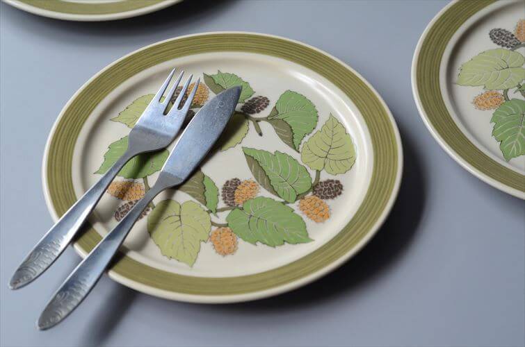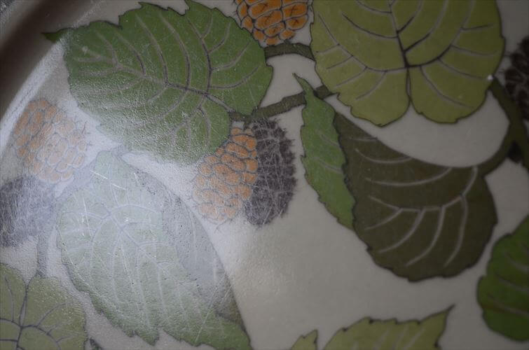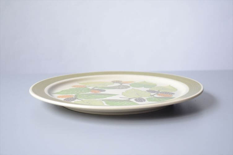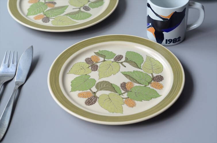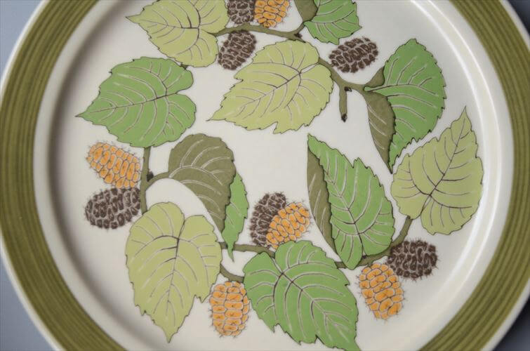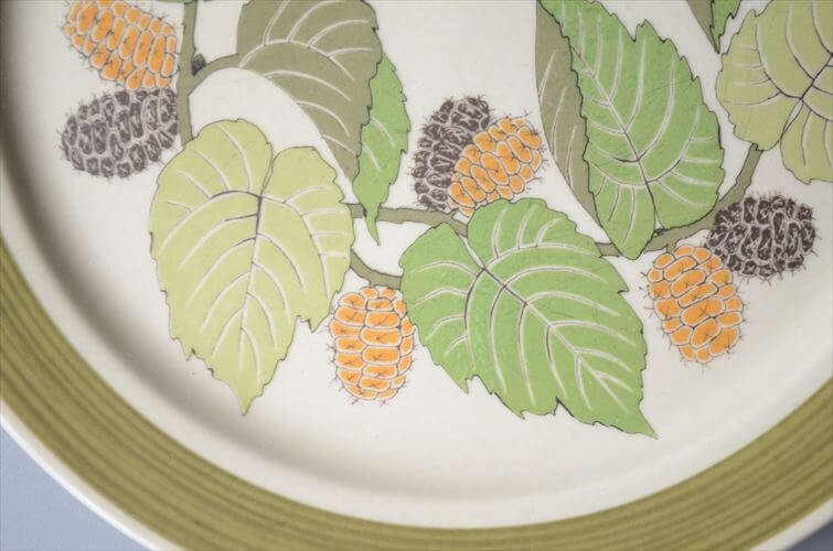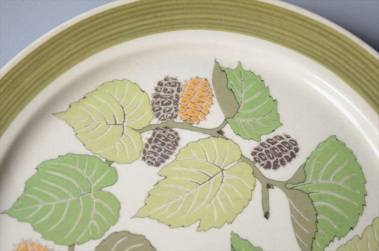 1960~70年台頃のお品で、グリーンの縁取りと、中央に描かれた葉と木の実の自然をモチーフにしたナチュラルなデザインが魅力的です。