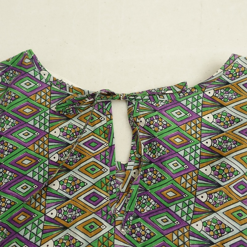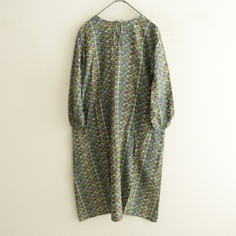 mina perhonenのpesce コットンシルクプリントAラインドレスワンピースです。カラーはホワイト・サックス・ライトグリーン・パープル・ブラック・キャメルで、総柄プリントの薄手地で仕立てられております。袖丈は8分くらい、バック襟元のりぼんひも開閉のプルオーバータイプで、両サイドにシームポケットが付いております。 |