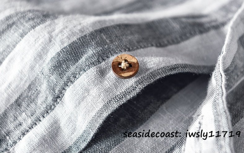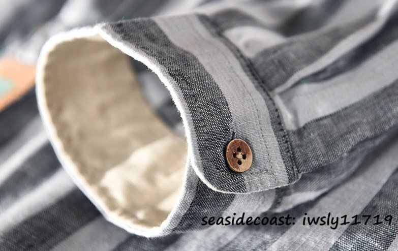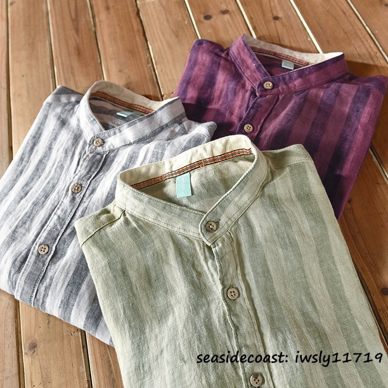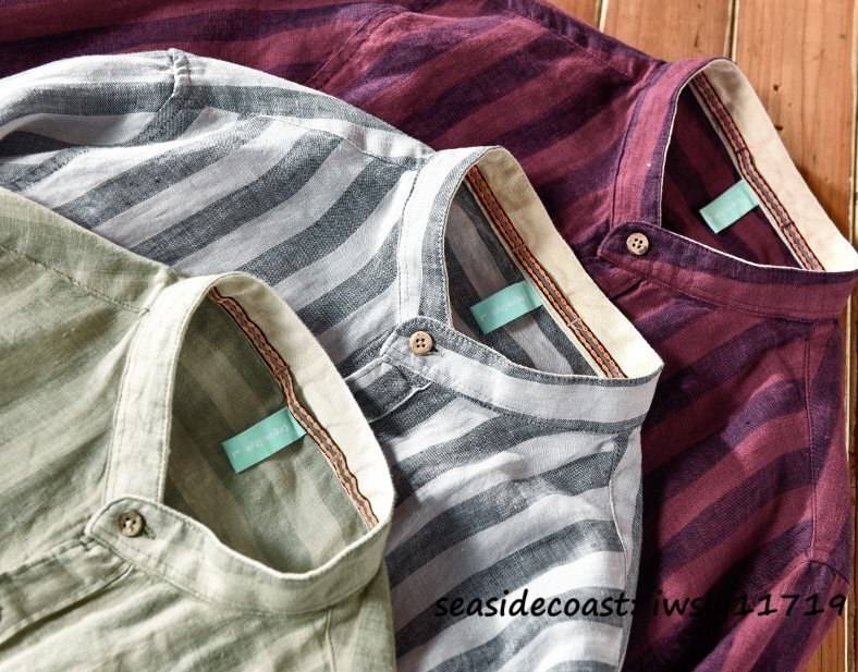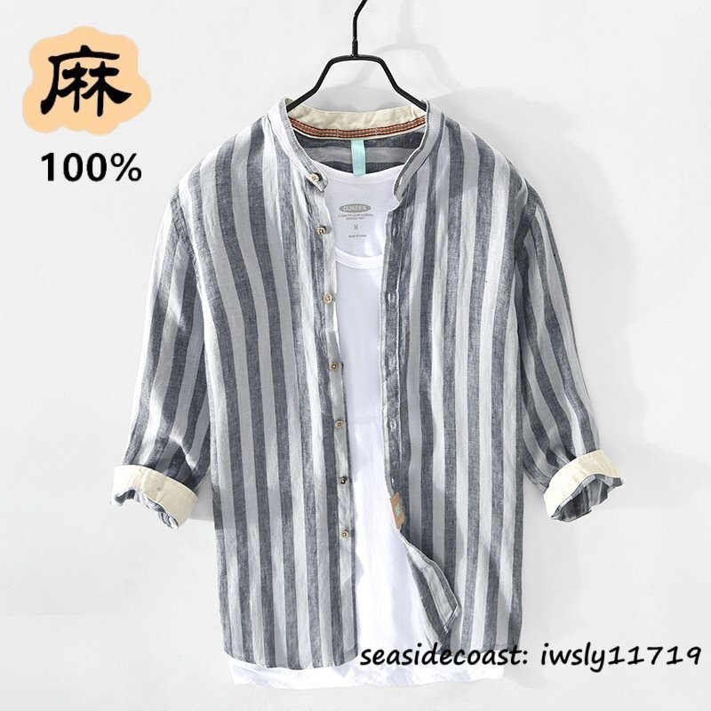 爆売り★七分袖シャツ メンズ 麻100% ストライプ柄 立ち襟 清涼感 通気性 リネンシャツ 亜麻 紳士服 春夏秋 カジュアル 新品 グレー XL