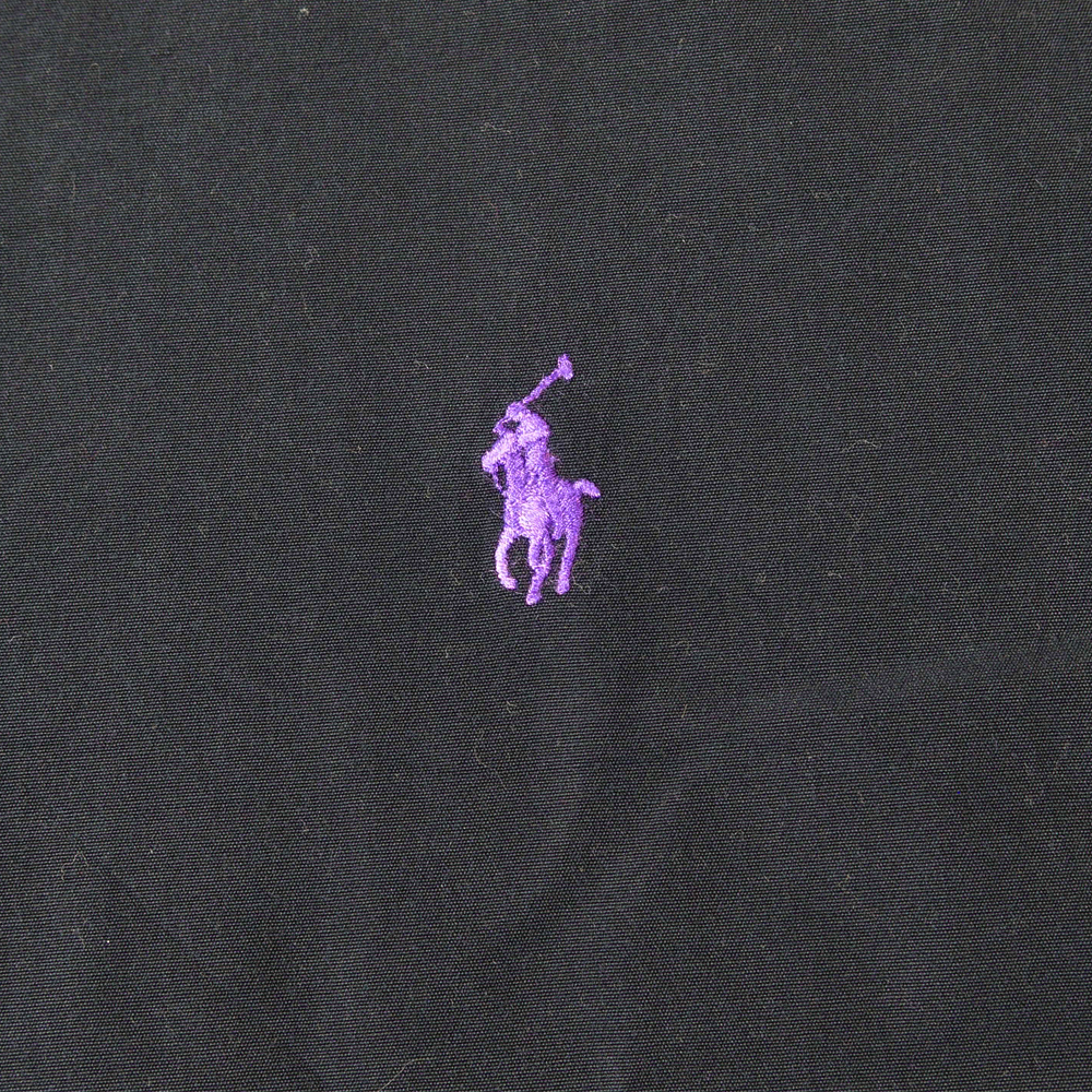 左胸のパープルのポロプレイヤー刺繍が上品なアクセントになっています。