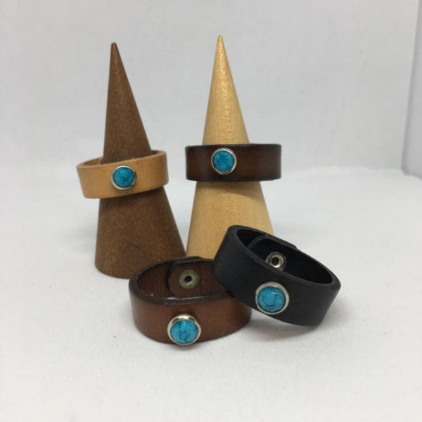 ・9ミリ幅のイタリー製レザーにターコイズの飾りカシメを留めたハンドメイドのレザーリングです。