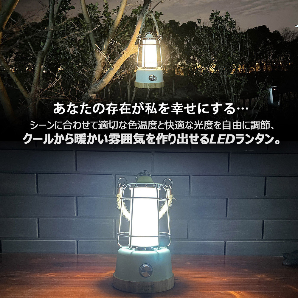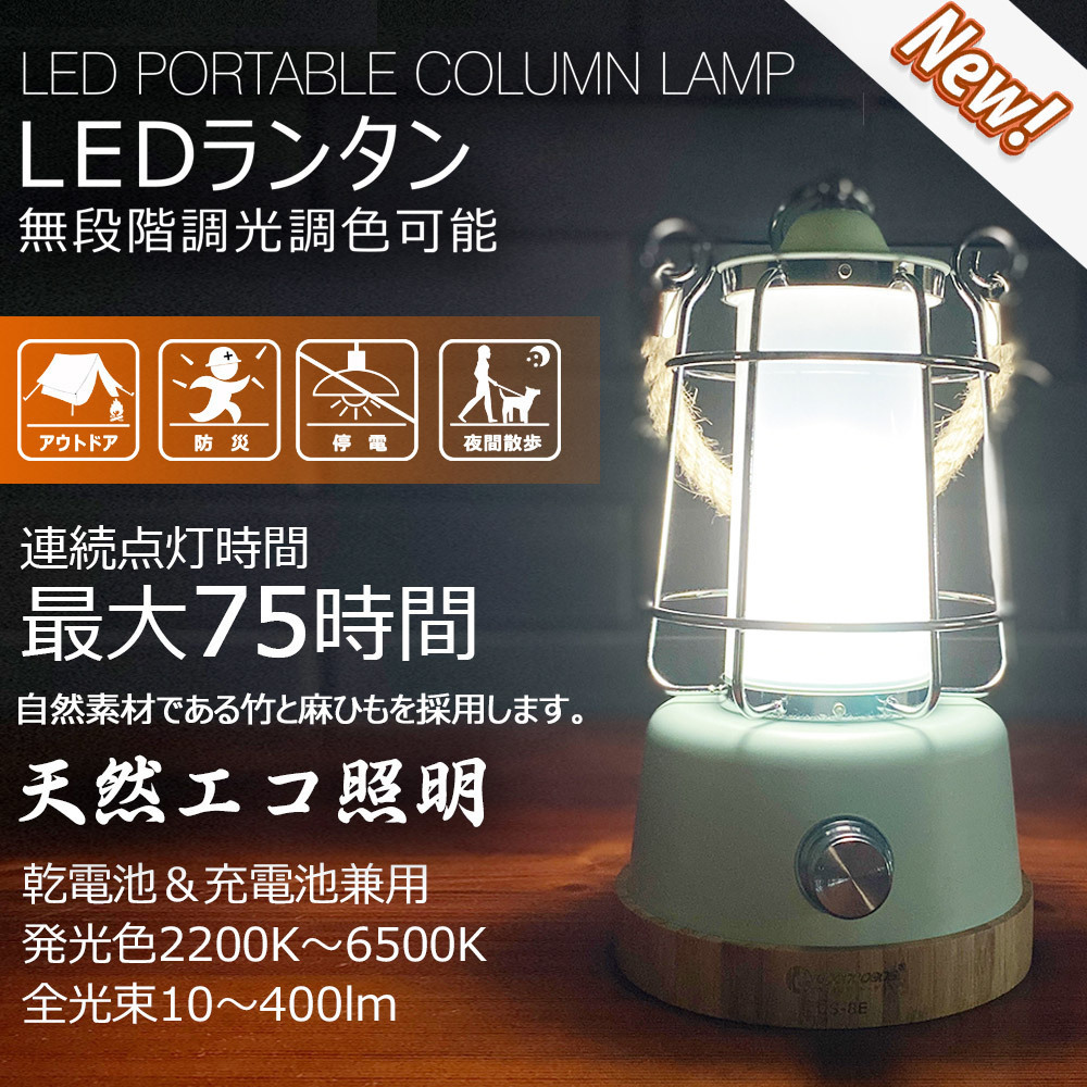 ★オススメポイント★ 無段階で調光調色できるアンティーク調ランタンです。 キャンプランタンとしては勿論、インテリアとしてもおススメです。 充電式で、乾電池も使用できますので、防災グッズとして、災害の備えにもおススメです。 可愛いパステルグリーン 一目ぼれしてしまう、レトロなデザインと可愛らしい色味。 無段階調光&調色 明るさは10~400lmまで。色温度は2200K(電球色)~6500K(昼光色)まで、ダイヤル式ボタンで自在に調節できます。 USB充電式&電池式 USB充電式と電池式の2種類給電方式があります。 ●USB充電式: USB充電ケーブルは付属していますので、ノートパソコンやモバイルバッテリーなどから簡単に充電できます。 ●電池式: 単3乾電池でも使用できます。 汎用性に優れた単三乾電池*3本を使用し、突然の停電や充電切れにも安心です。 ※単3乾電池は別売りです。 常用点灯時間は驚異の最大75時間 最大400ルーメンの出力で5時間、10ルーメンで75時間以上点灯できます。 アウトドアや停電時にも優しくしっかり灯ります。 高いデザイン性 ハンドル部分に麻紐を、土台部分には竹素材を使用しています、お部屋や玄関先などインテリアの一つとしても存在感のあるデザインです。 ●便利な持ち手: ハンドル部分は麻紐で、持ち運びのほか、ランタンポールやテント内などに吊り下げるのも可能です。 ●USB出力ポート: アウトドアや緊急時、スマホなどUSB機器の充電用モバイルバッテリーとしても使えます。 ●防眩加工: 2重防眩カバーで光源を包み眩しさを軽減し、目に優しく温もりのある空間を演出します。 充電池・乾電池兼用式 ミニドライバー付属していますので、充電池の交換や乾電池での使用は簡単にできます。 |