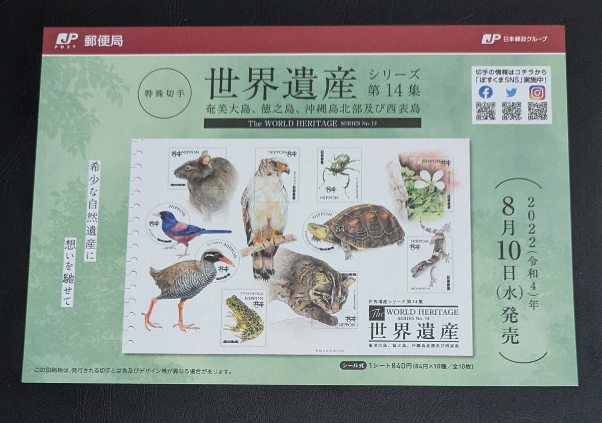 2022年・記念切手-第3次世界遺産シリーズ第14集(奄美大島,徳之島、沖縄島北部及び西表島)解説書付シート