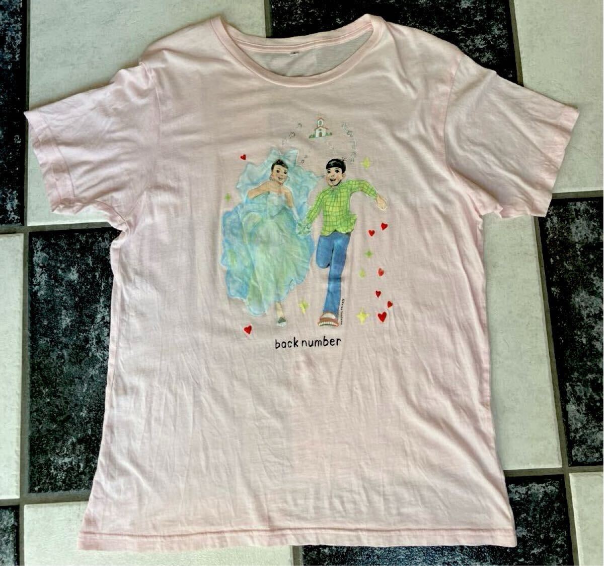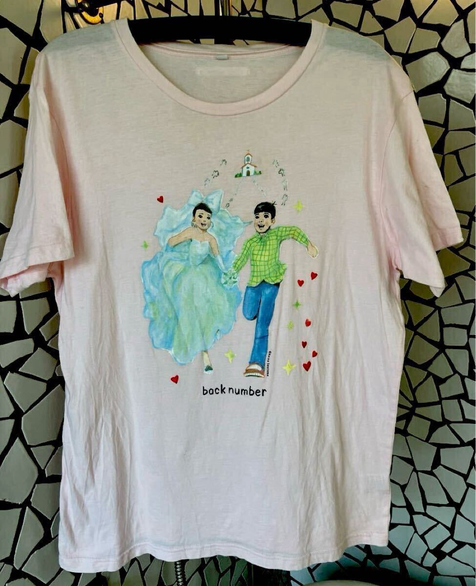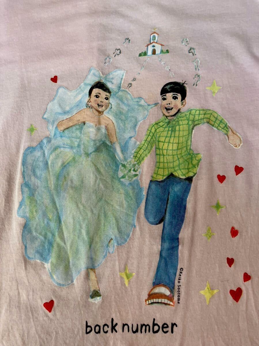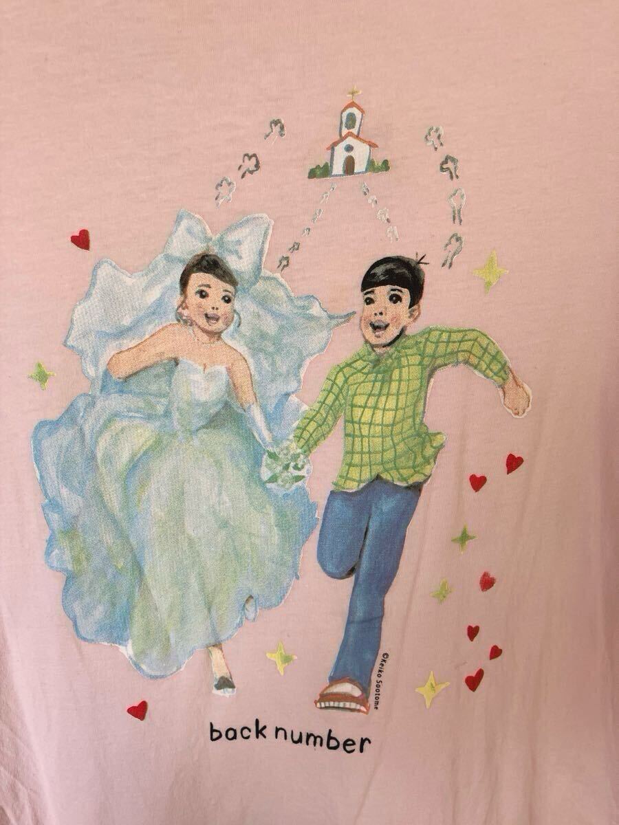back unmberの「そのドレスちょっと待った」Tシャツです。五月女ケイ子さんが映画「卒業」を思わせるキュートでわくわくするイラストを描いています。
