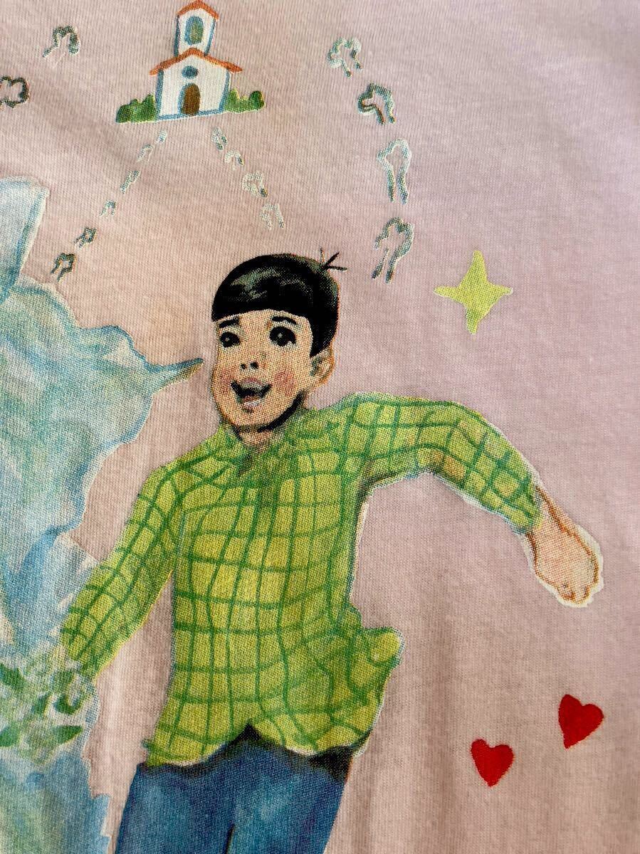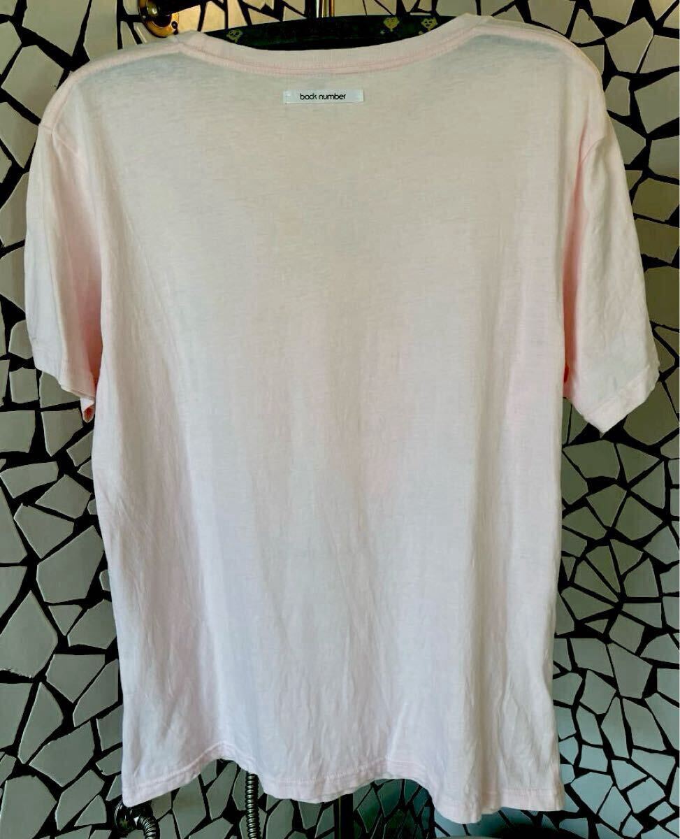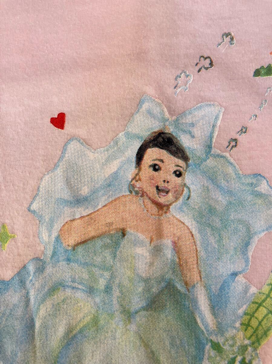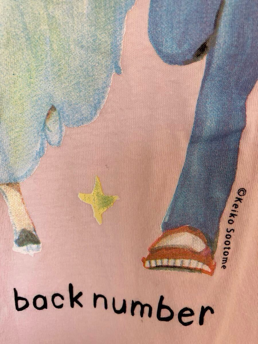 back unmberの「そのドレスちょっと待った」Tシャツです。五月女ケイ子さんが映画「卒業」を思わせるキュートでわくわくするイラストを描いています。