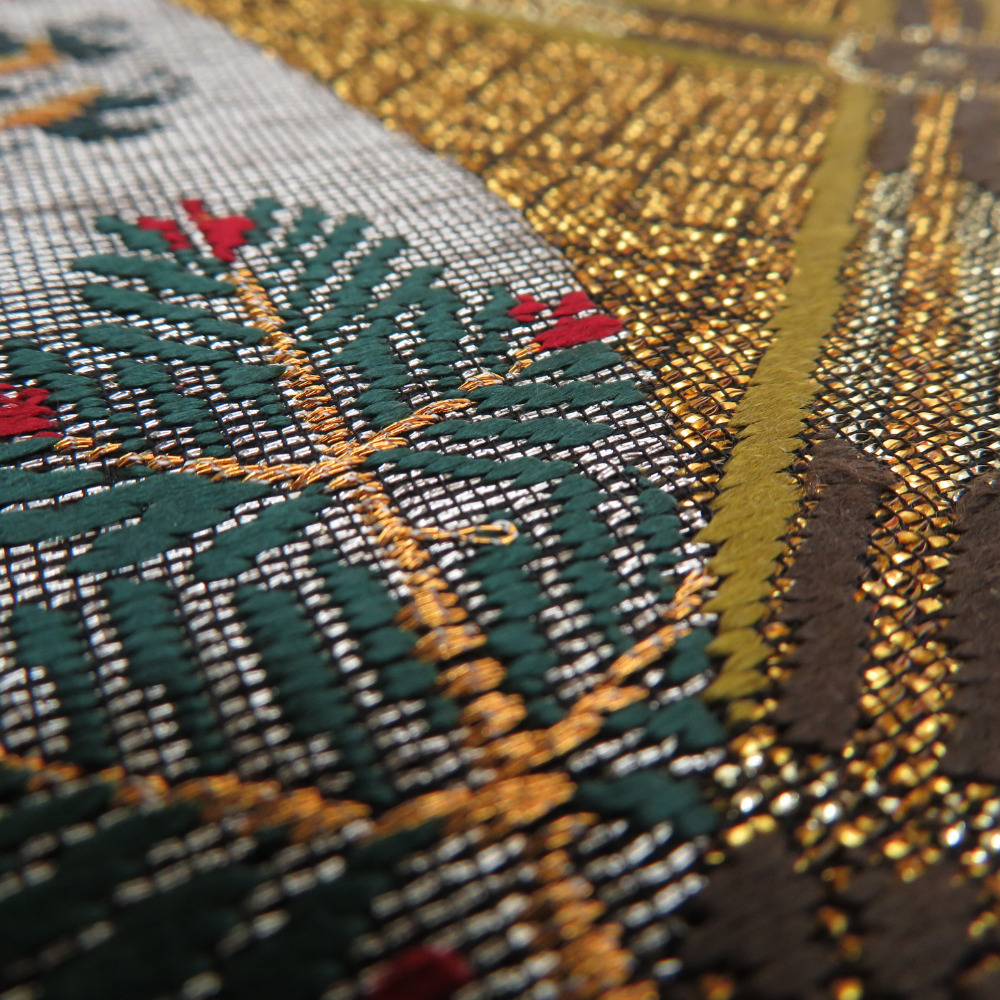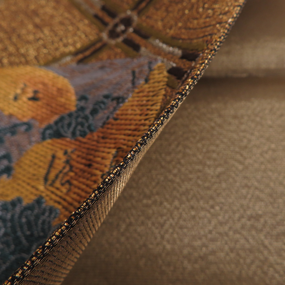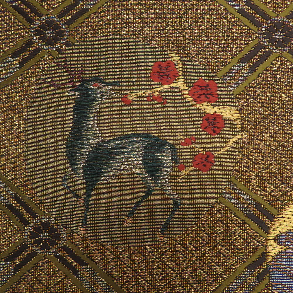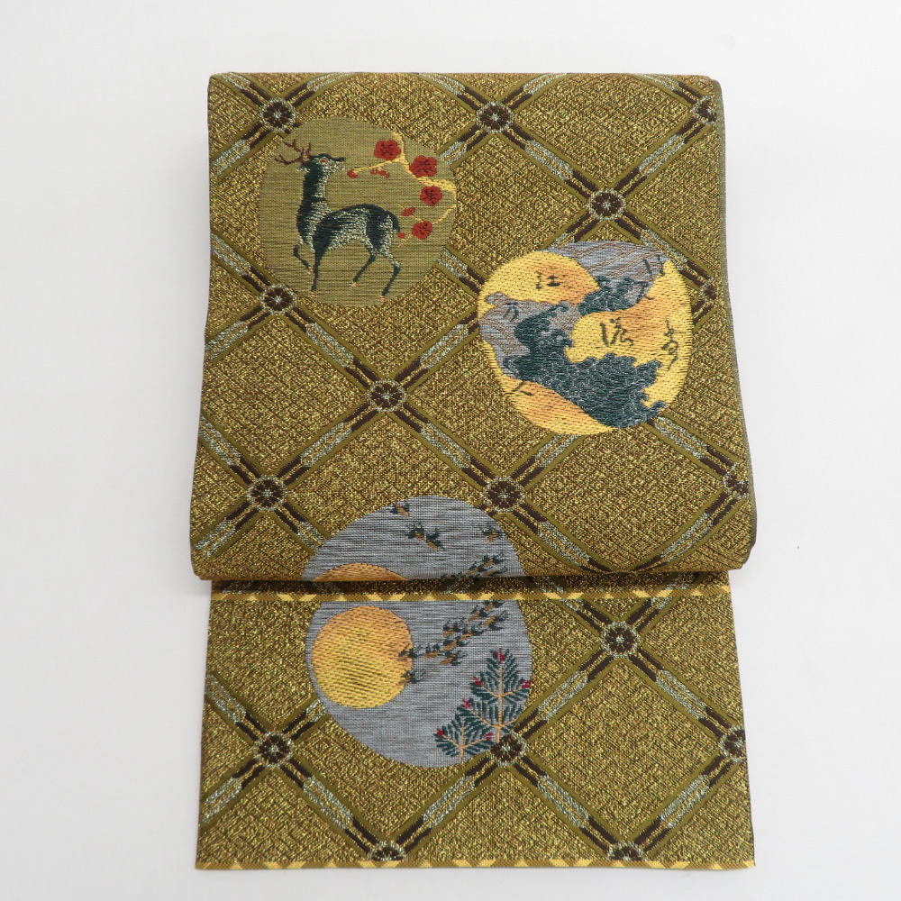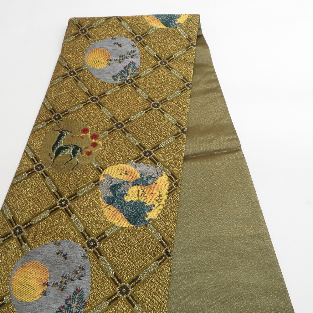 | 袋帯 正絹 金糸銀糸 丸に鹿と風景文様 金色x緑色 六通柄 フォーマル 礼装 長さ440cm |