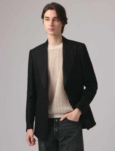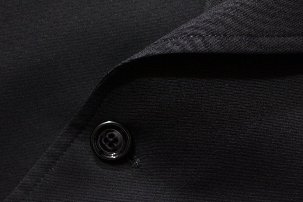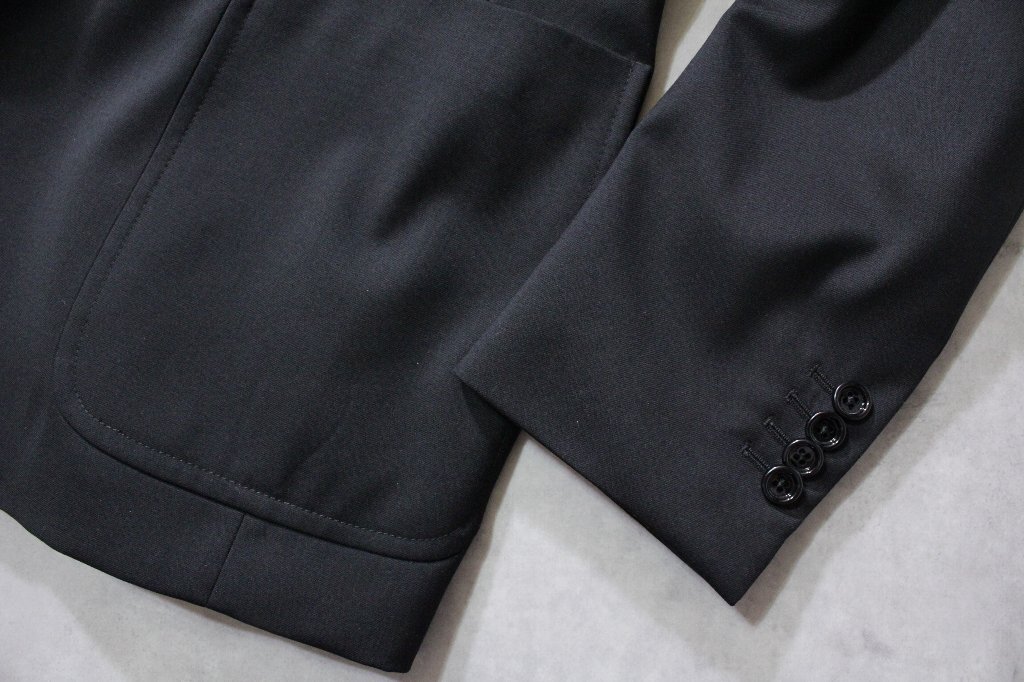 1ボタン、ピークド、スクエアショルダー、ブラック無地、といったタキシードのディテールをベースにして