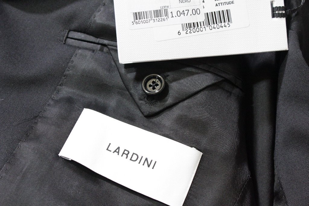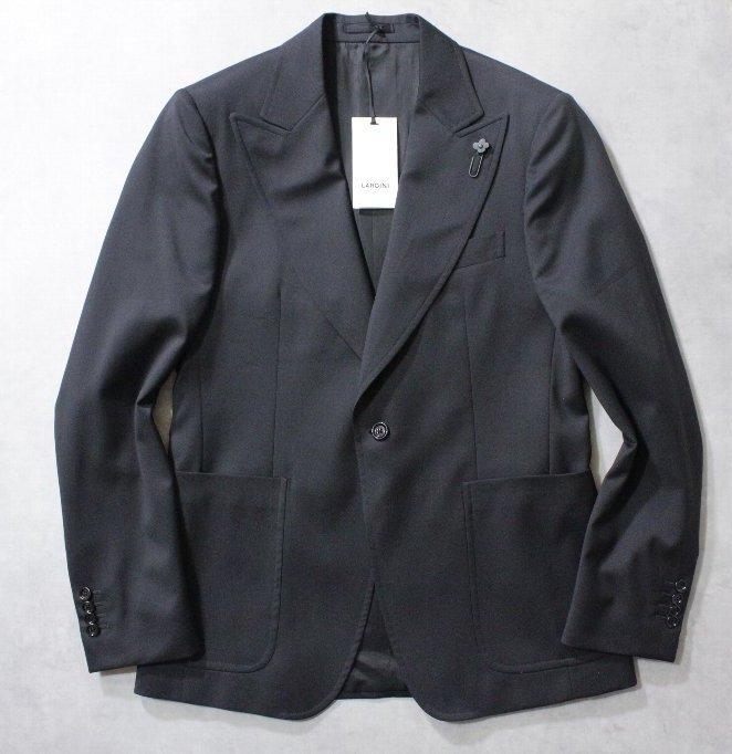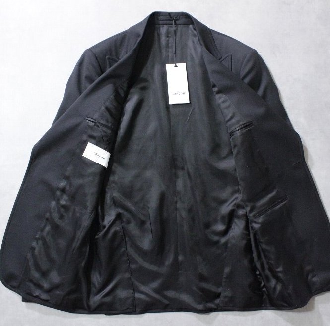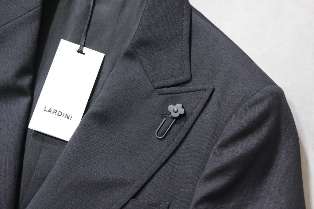 LARDINI★新品20万円 新生ラルディーニ「ATTITUDE」ブラック無地のピークドラペル1Bジャケット 48 ラペルピン付き
