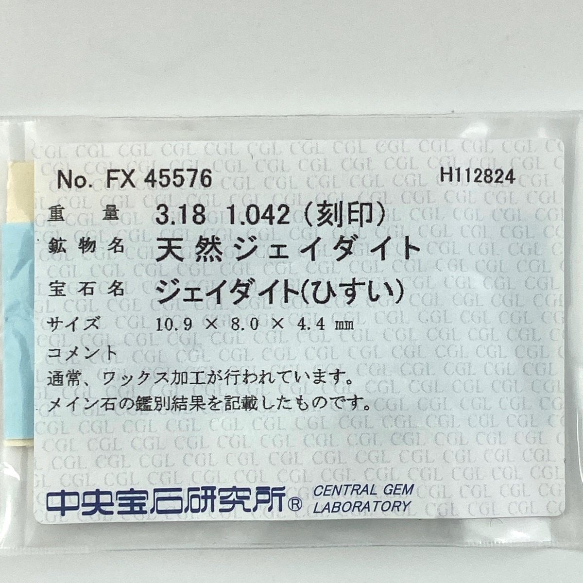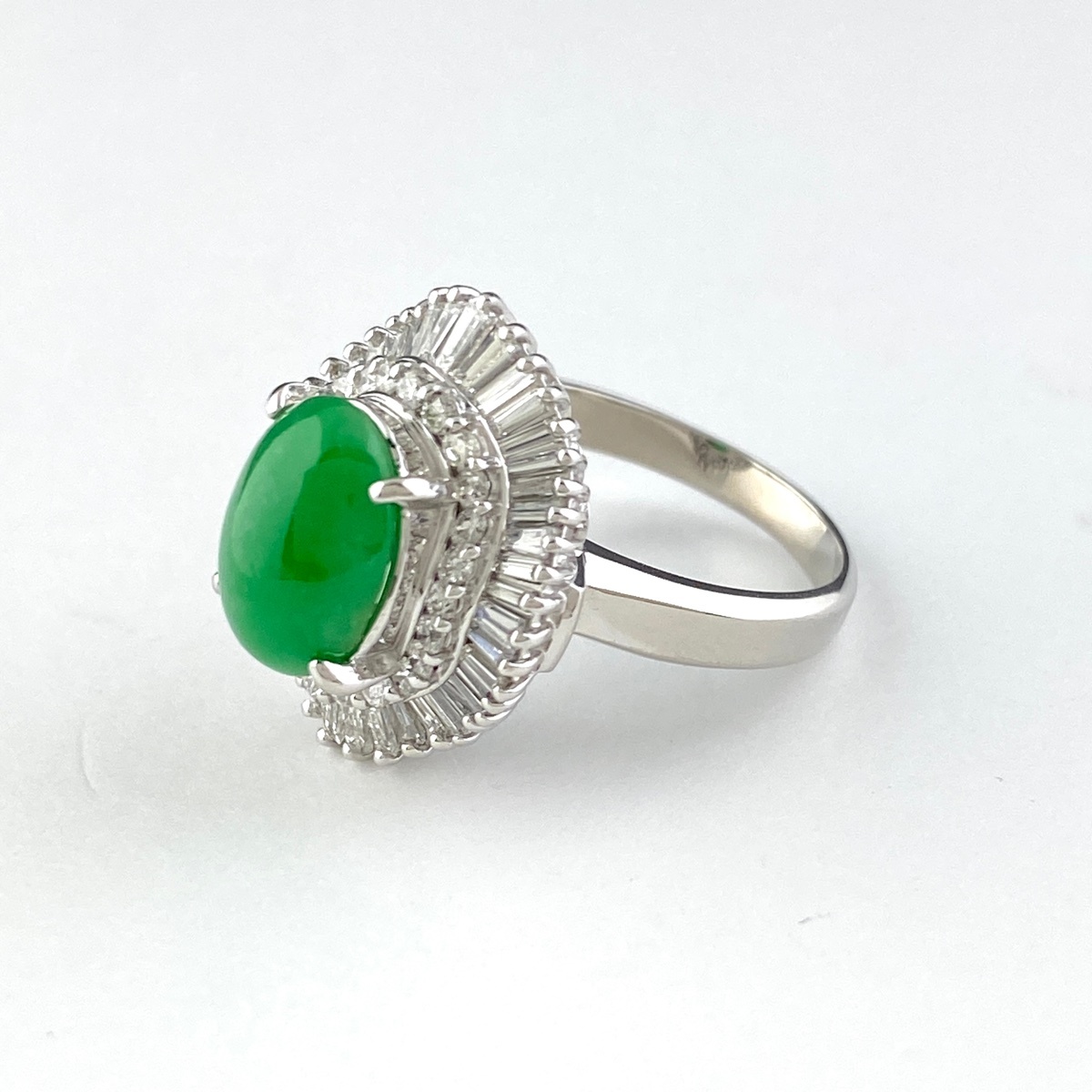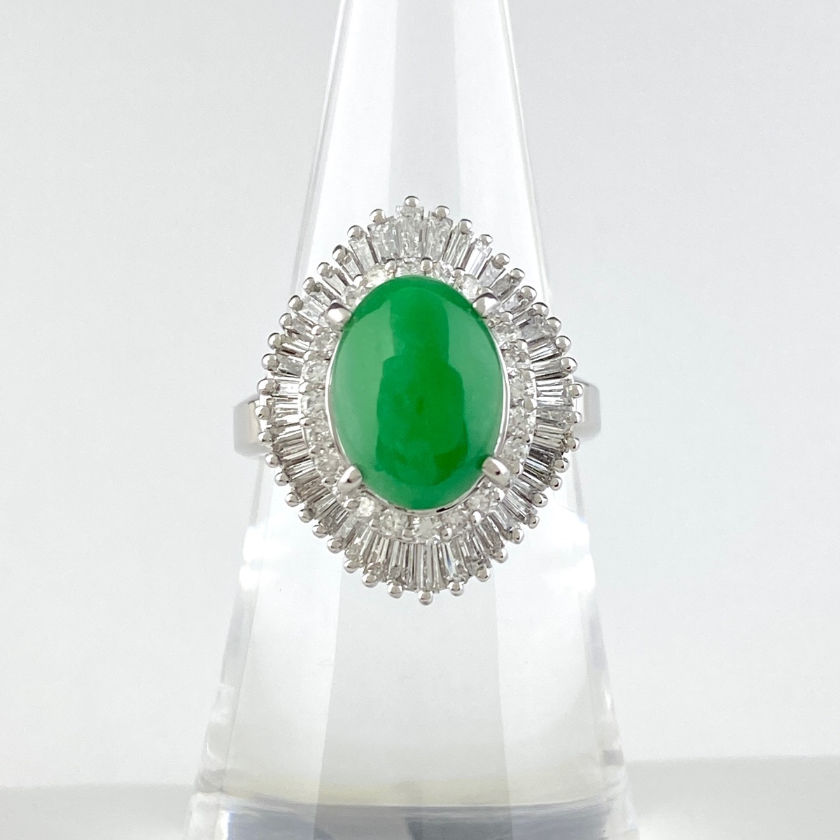 翡翠:3.18ct、メレダイヤ:1.042ct 中古品の為、若干のキズや汚れ、サイズ直しの跡がございます。 |