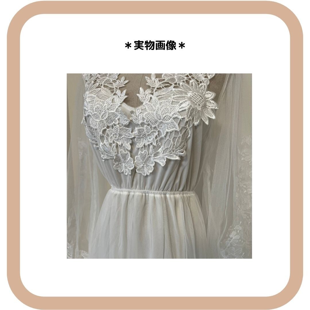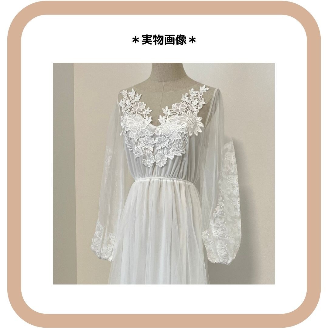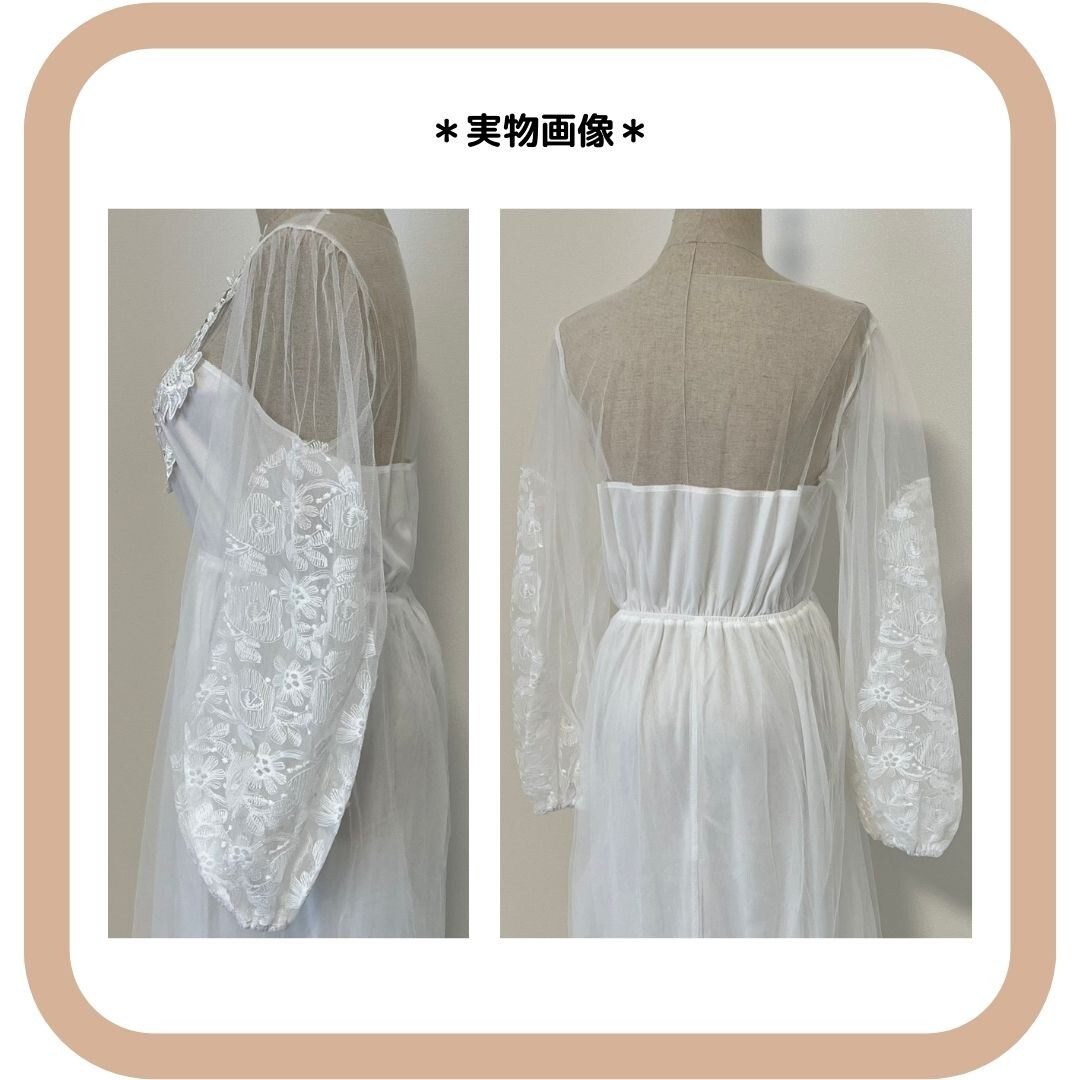 華やか な ボリュームチュール の マキシ丈 長袖 ホワイトドレス。