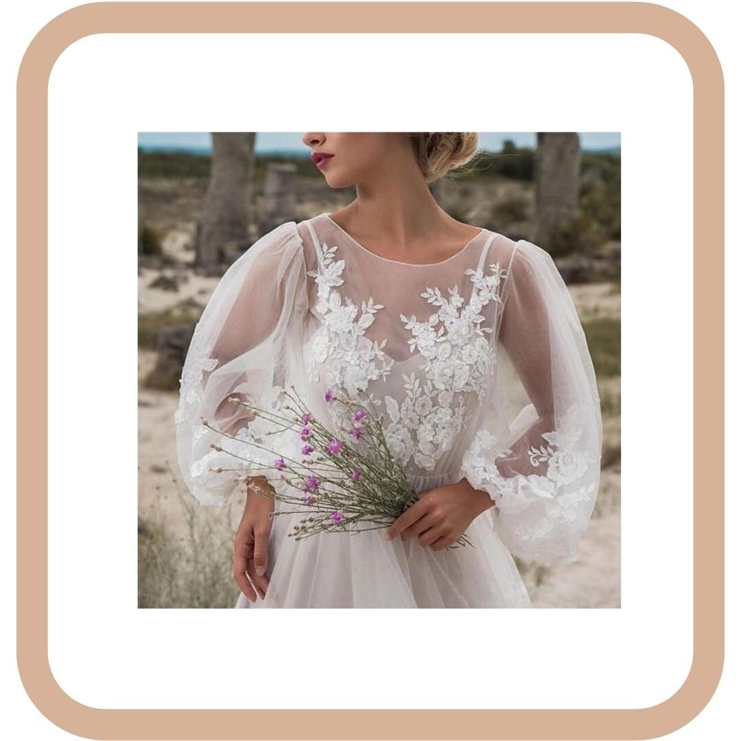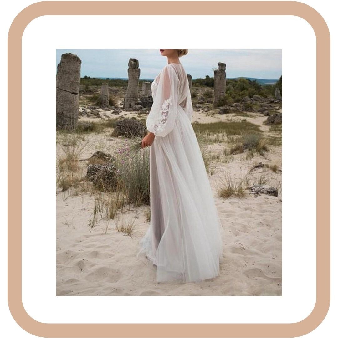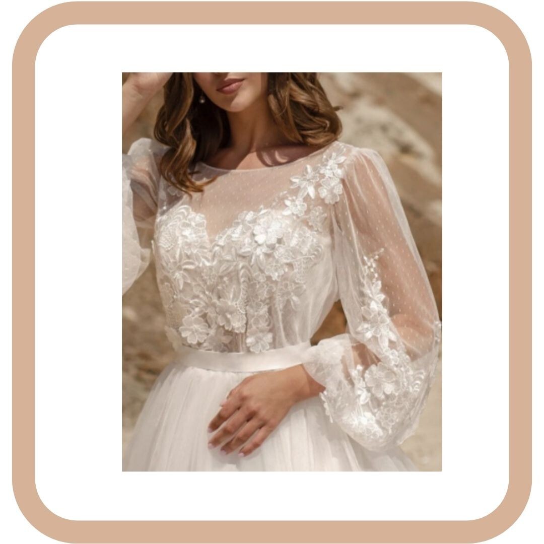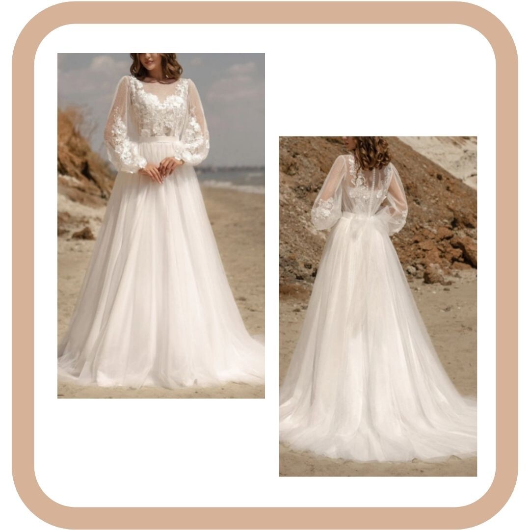 華やか な ボリュームチュール の マキシ丈 長袖 ホワイトドレス。
