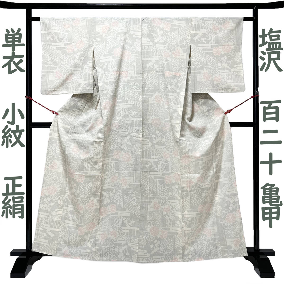 着物 単衣 正絹 小紋 塩沢 塩澤 120亀甲 夏用 ホワイトグレー 牡丹 カジュアル 中古 仕立て上り Mサイズ MWR-No.275 13092025 マダム 和装