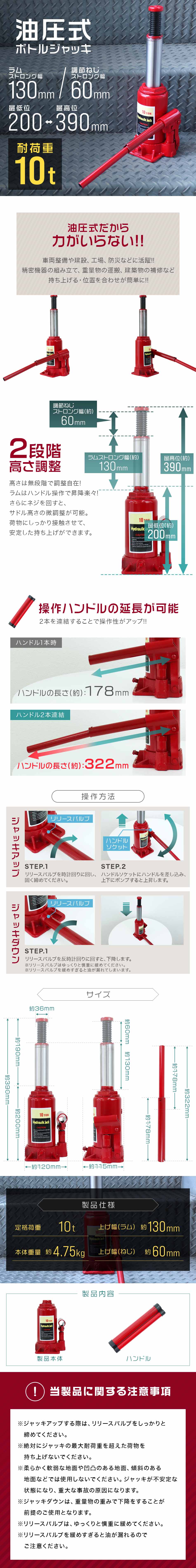 コンパクトなデザインで持ち運びしやすく、使いやすいジャッキです。 タイヤやホイール、マフラー交換の際に必要なジャッキです。 油圧式のため簡単にジャッキアップが可能です。 高さは二段階調整でき、荷物にしっかり接触させて安定した持ち上げが可能です。 また、操作ハンドルの延長が可能です。 二本を連結することで操作性がアップ! 【仕様】 サイズ 本体:(約)120mm×115mm×200-390mm ハンドル:長さ(約)178-322mm 定格荷重:10t 重量:(約)4.75kg 上げ幅(ラム):(約)130mm 上げ幅(ねじ):(約)60mm |