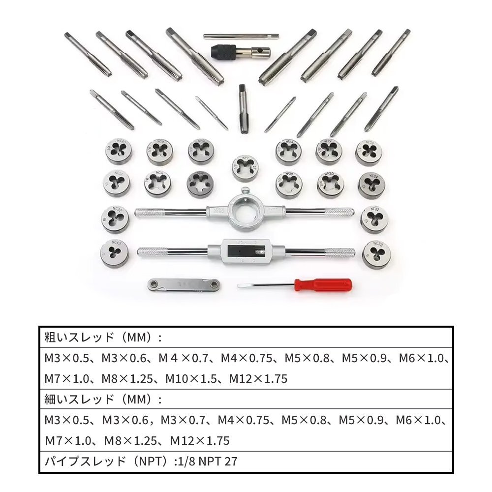 | 商品説明 | タップダイスセットになります。 【タップとダイスのサイズ】 粗いスレッド(mm):3 x 0.5、3 x 0.6、4 x 0.7、4 x 0.75、5 x 0.8、5 x 0.9、6 x 1.0、7 x 1.0、8 x 1.25、10 x 1.5、12 x 1.75 細いスレッド(mm):6 x 0.75、7 x 0.75、8 x 1.0、10 x 1.25、12 x 1.5 パイプスレッド(NPT):1/8 NPT 27 【材質】 ・硬化合金鋼を採用しおり、強度があり、鋳鉄、鋼、アルミニウム、銅などの材料に対応できます。 【用途】 ・このセットは、ナット、ボルト、ねじ山修正に役立ちます。交換用のボルトがなかなか見つからない場合は、このねじ山タップセットを使用してねじ山の修復をしてください。 【40PCパッケージ】 ・タップx17、ダイスx17、調整可能なタップレンチx1、T型タップハンドルx1、調整可能なダイレンチx1、ミニ1/8 "フラットドライバー x1、スレッドピッチゲージx1、収納ケースx1。 【制限スロット】 ・収納ケース、各部品に対してスロットがあります。 ※こちらの商品は宅配便サイズになります。 |