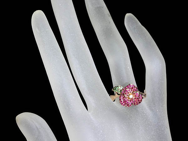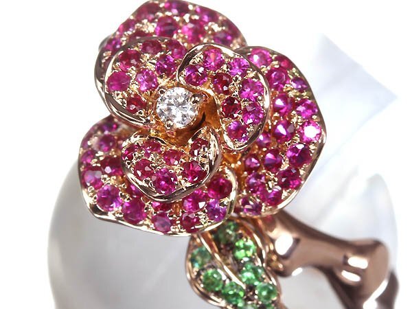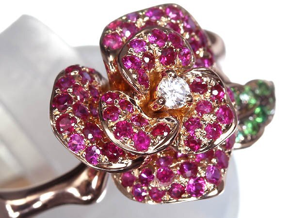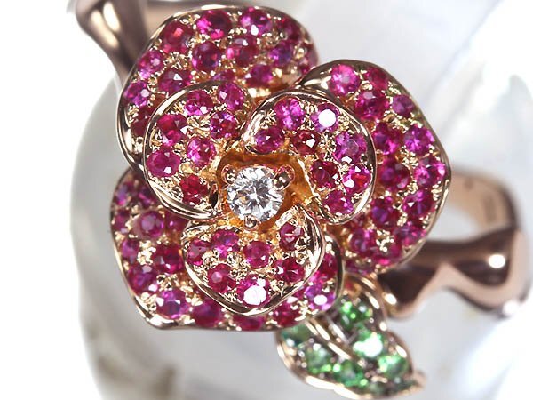 極上ルビーの濃厚なピンキッシュレッドの輝きが素敵なこちら!!! 極上ルビーならではの華やかなお色と艶やかな輝きを、総計0.67ctのボリューム感と共にご堪能いただける大変魅力的なお品でございます!!! デザインのアクセントには、輝く極上グリーンガーネット&極上ダイヤモンドを宝飾!!! 極上2宝石の輝きが、極上ルビーを引き立てています!!! 薔薇をモチーフにしたエレガントなデザインには、高級素材K18ピンクゴールドを使用!!! 2色のゴールドの質感とデザインが、洗練された高級感を演出します!!! こちら格安での出品となっておりますので、この機会是非お見逃しなく!!! ◆こちらの商品はお客様の希望がある場合のみ、評価をつけております。 評価希望のお客様は、オーダーフォームの要望欄にてお知らせくださいませ。 |